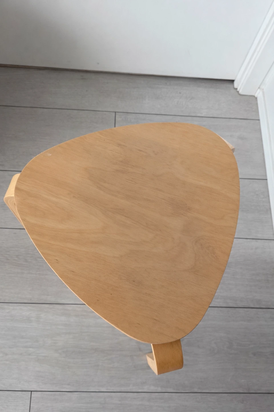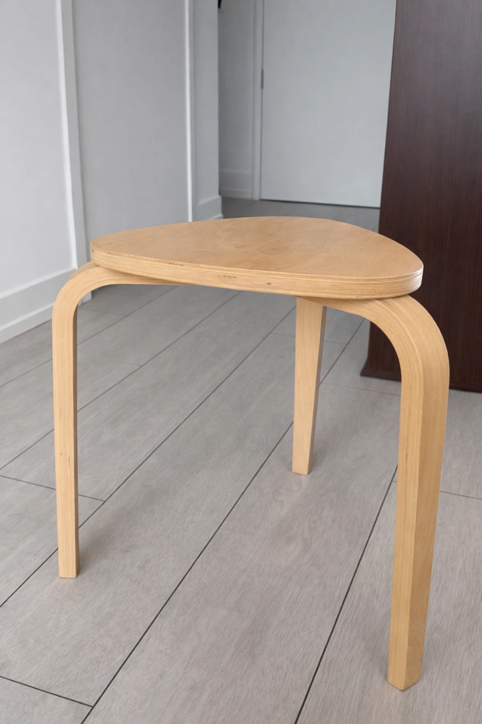 This is a bentwood stool with a light wood finish. It's made from laminated wood and features a triangular seat with three legs. Its compact size makes it handy for occasional seating.