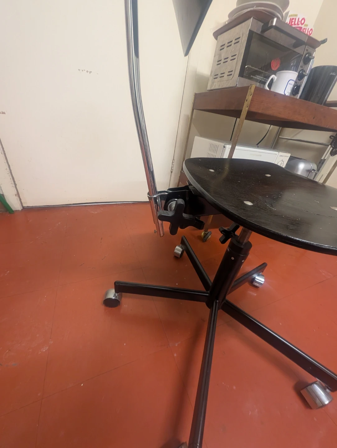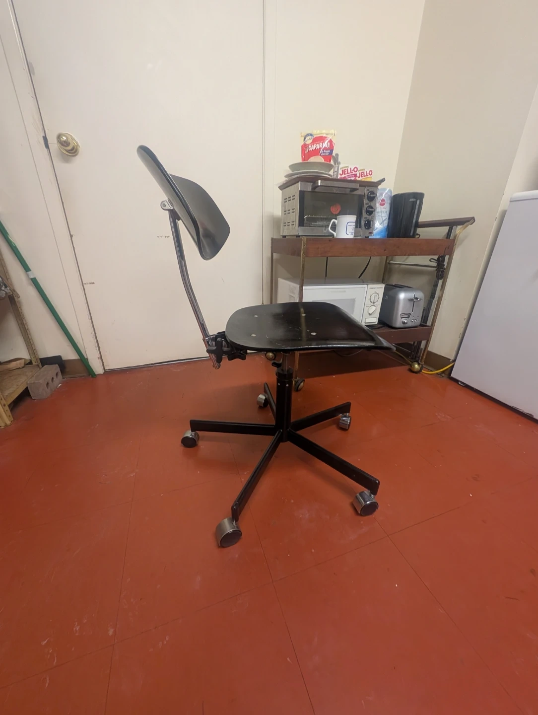 This is a black office chair with an adjustable height and a five-star base with wheels. It offers a supportive backrest and is great for general office use. The chair is made with durable materials.