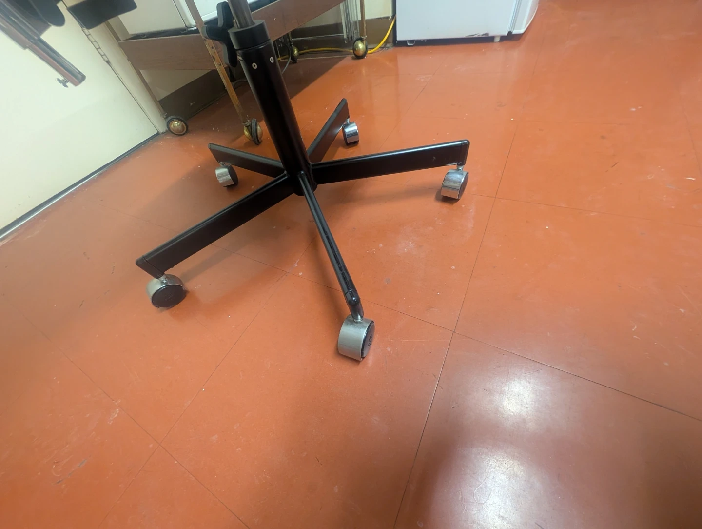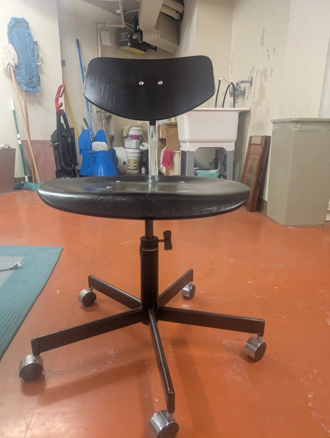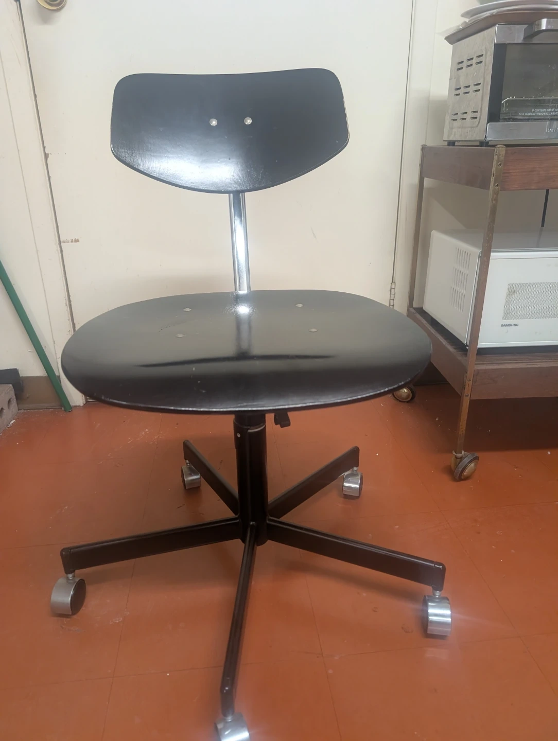 This is a black office chair with an adjustable height and a five-star base with wheels. It offers a supportive backrest and is great for general office use. The chair is made with durable materials.