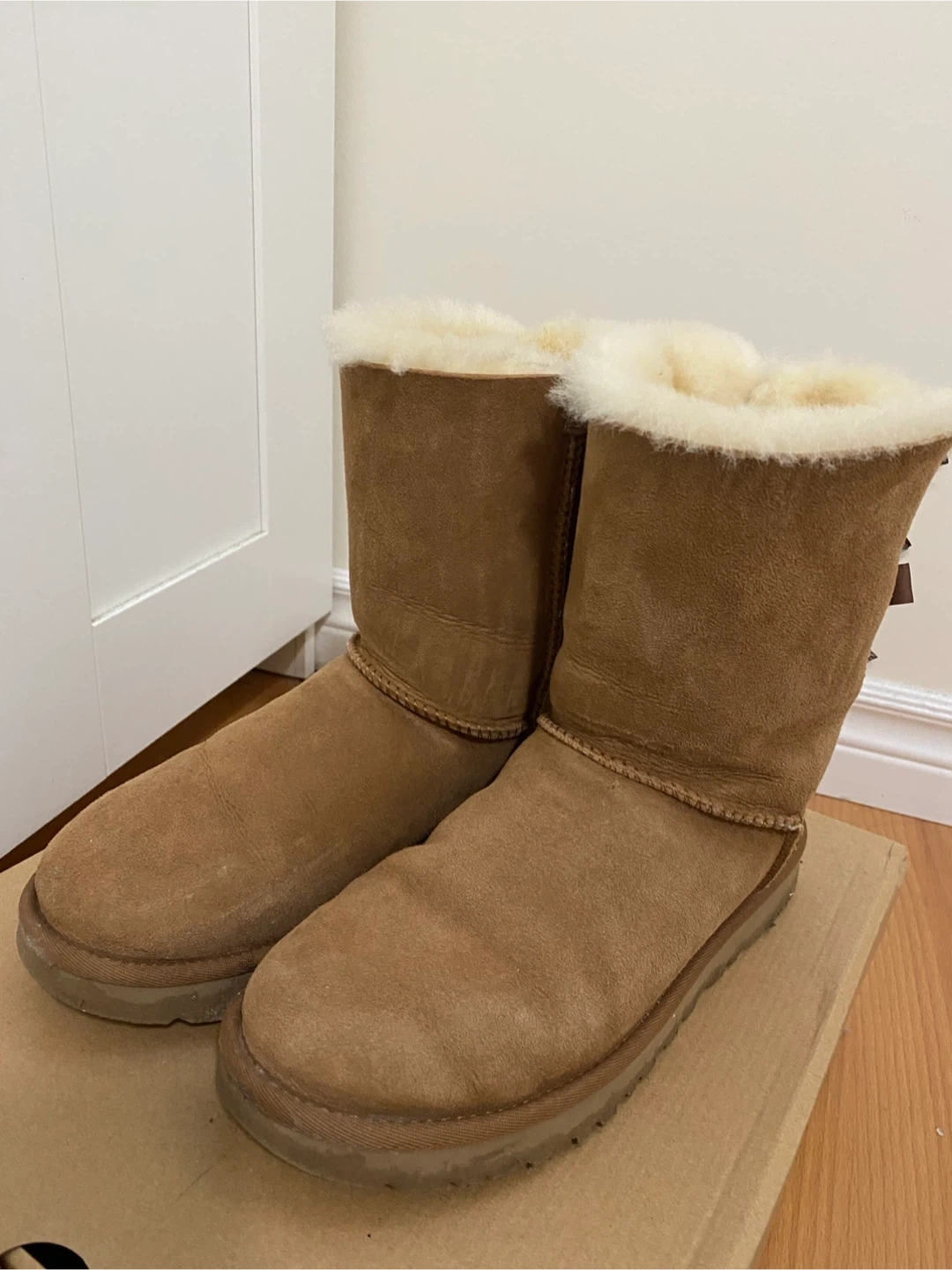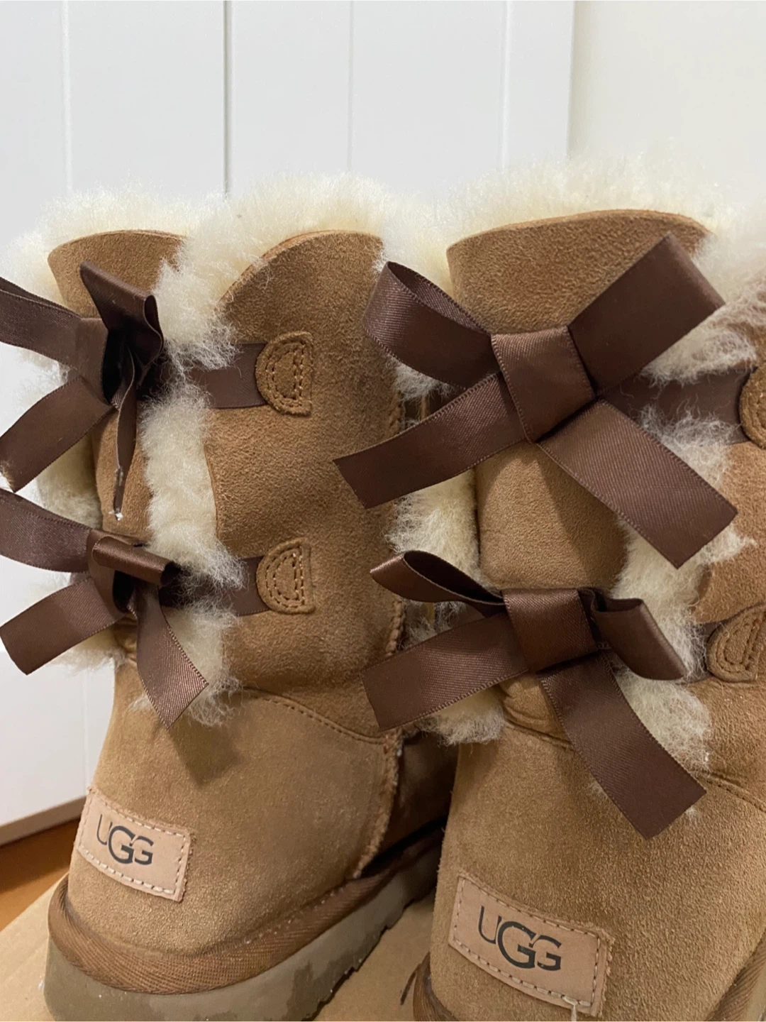 These UGG boots are the Bailey Bow II model. They're a women's size 8, featuring a classic chestnut colour and cosy sheepskin lining. The signature bows add a stylish touch. They're made in Vietnam. Perfect for keeping your feet warm and stylish during colder weather!