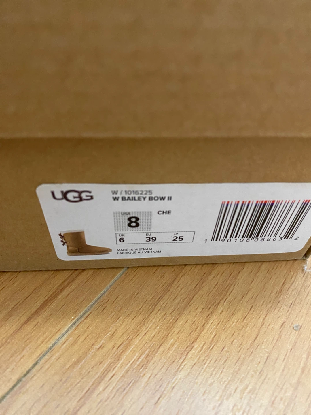 These UGG boots are the Bailey Bow II model. They're a women's size 8, featuring a classic chestnut colour and cosy sheepskin lining. The signature bows add a stylish touch. They're made in Vietnam. Perfect for keeping your feet warm and stylish during colder weather!