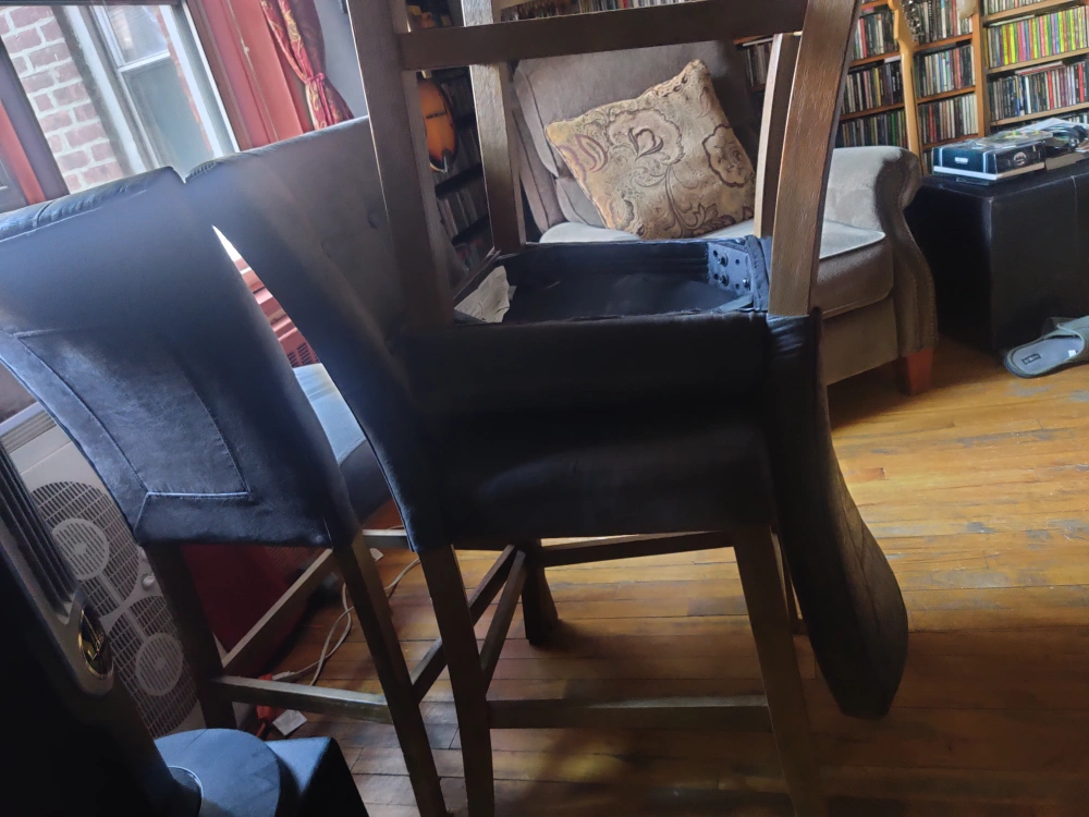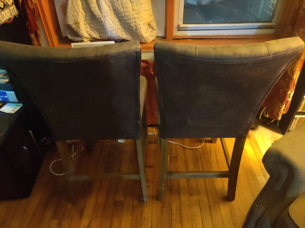 Selling a set of three bar stools with dark brown tufted upholstery. They feature wooden legs and a comfortable padded seat and back. These stools would be a great addition to a kitchen island or home bar!.. no rips or discoloration..legs do not wabble there solid strong