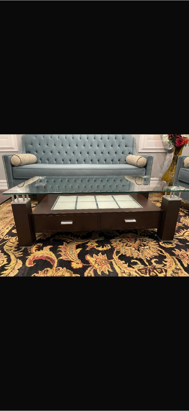 Stylish light blue sofa featuring deep button tufting on the backrest. It comes with two decorative bolster pillows. This piece has a classic look with nailhead trim along the arms and back. Adds a touch of elegance to any living space.