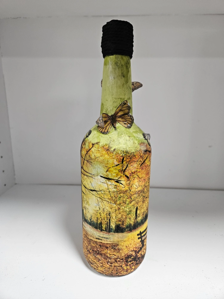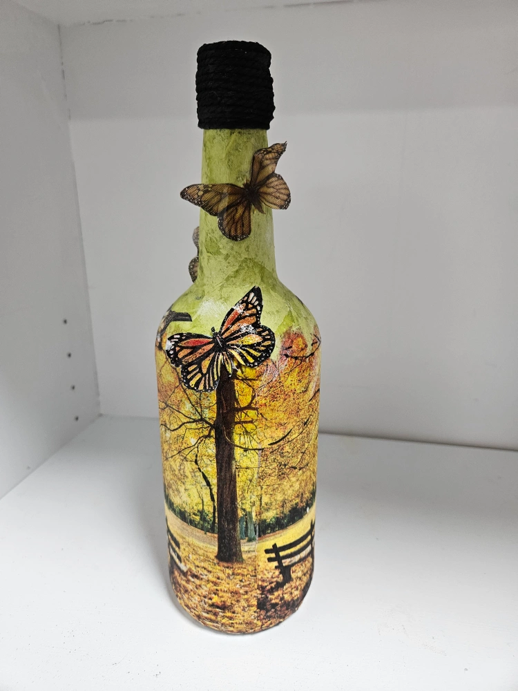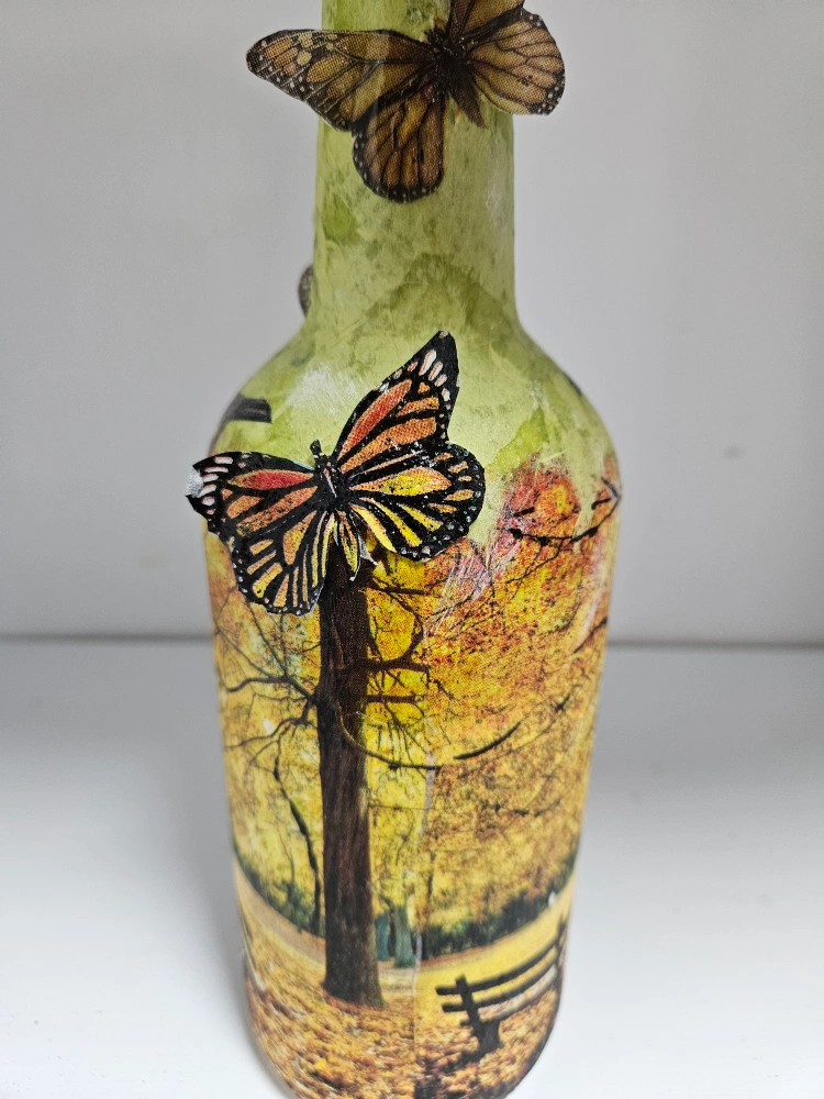 Unique decorative bottle. Features an autumnal park scene, birds, and butterflies. Bottle is painted green. Perfect for home decor.Paper Napkins cut out to detail and Mod Podged as well.Hand done by me :)