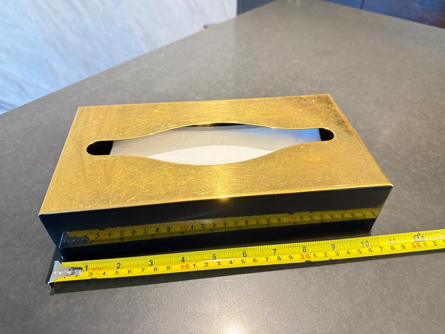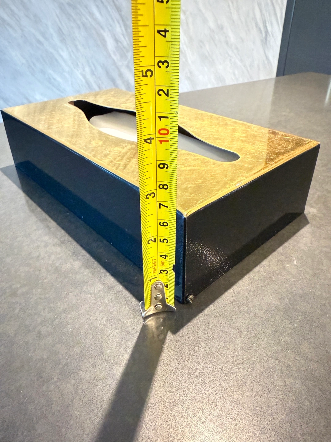 Here's a stylish tissue box cover that will add a touch of elegance to any room! It features a gold top and black base.