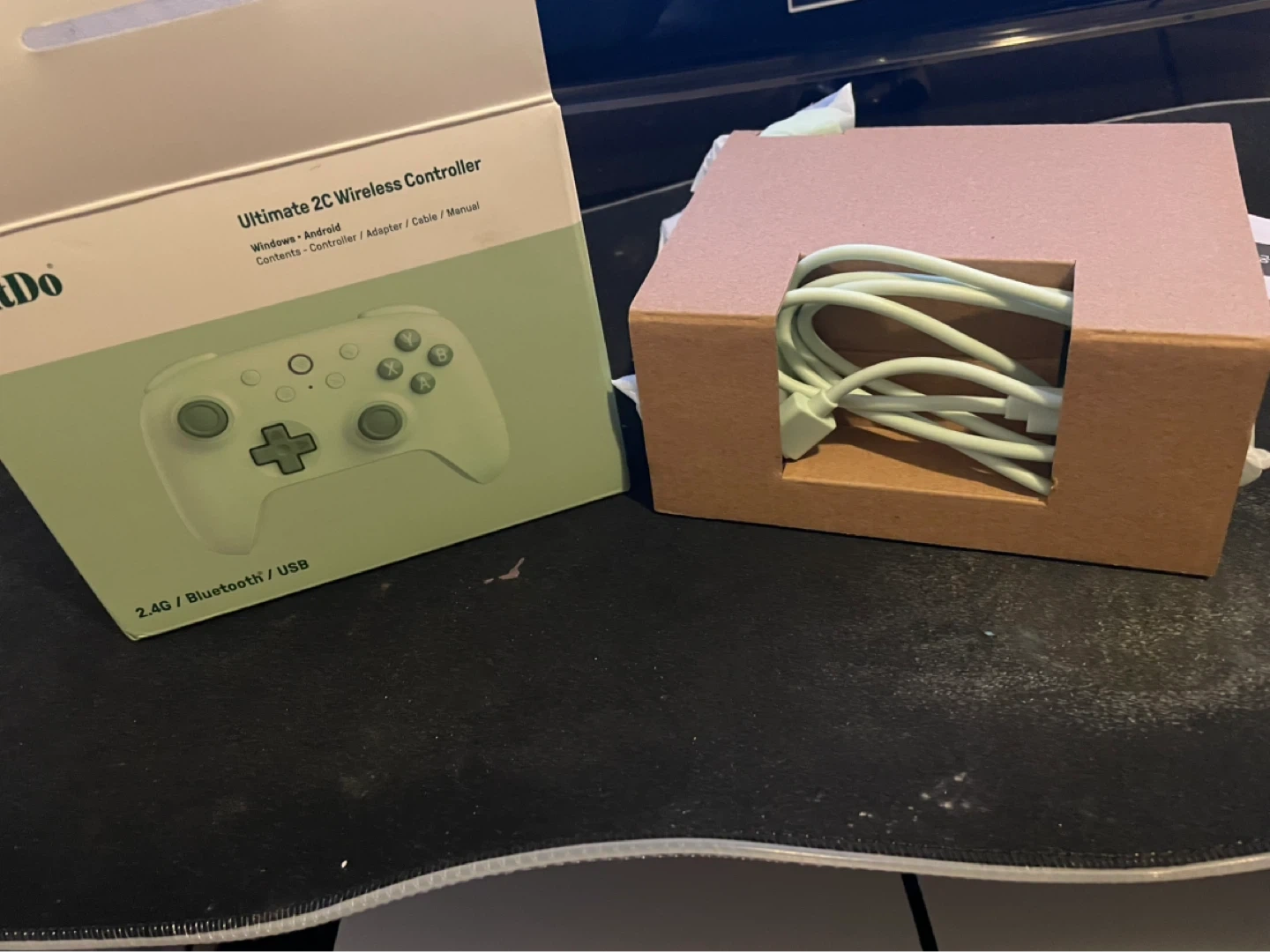This 8BitDo Ultimate 2C wireless controller is compatible with Windows and Android. It connects via 2.4G or USB. Includes controller, adapter, and cable.
