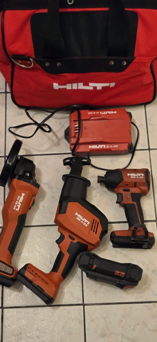 This Hilti cordless power tool set includes an angle grinder, reciprocating saw, and impact driver. It also comes with a charger, one batteries, and a red Hilti tool bag. This set is great for various job site applications!