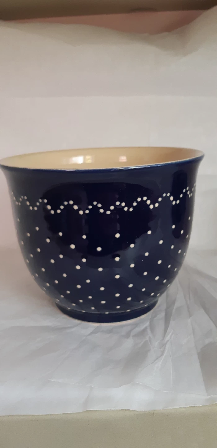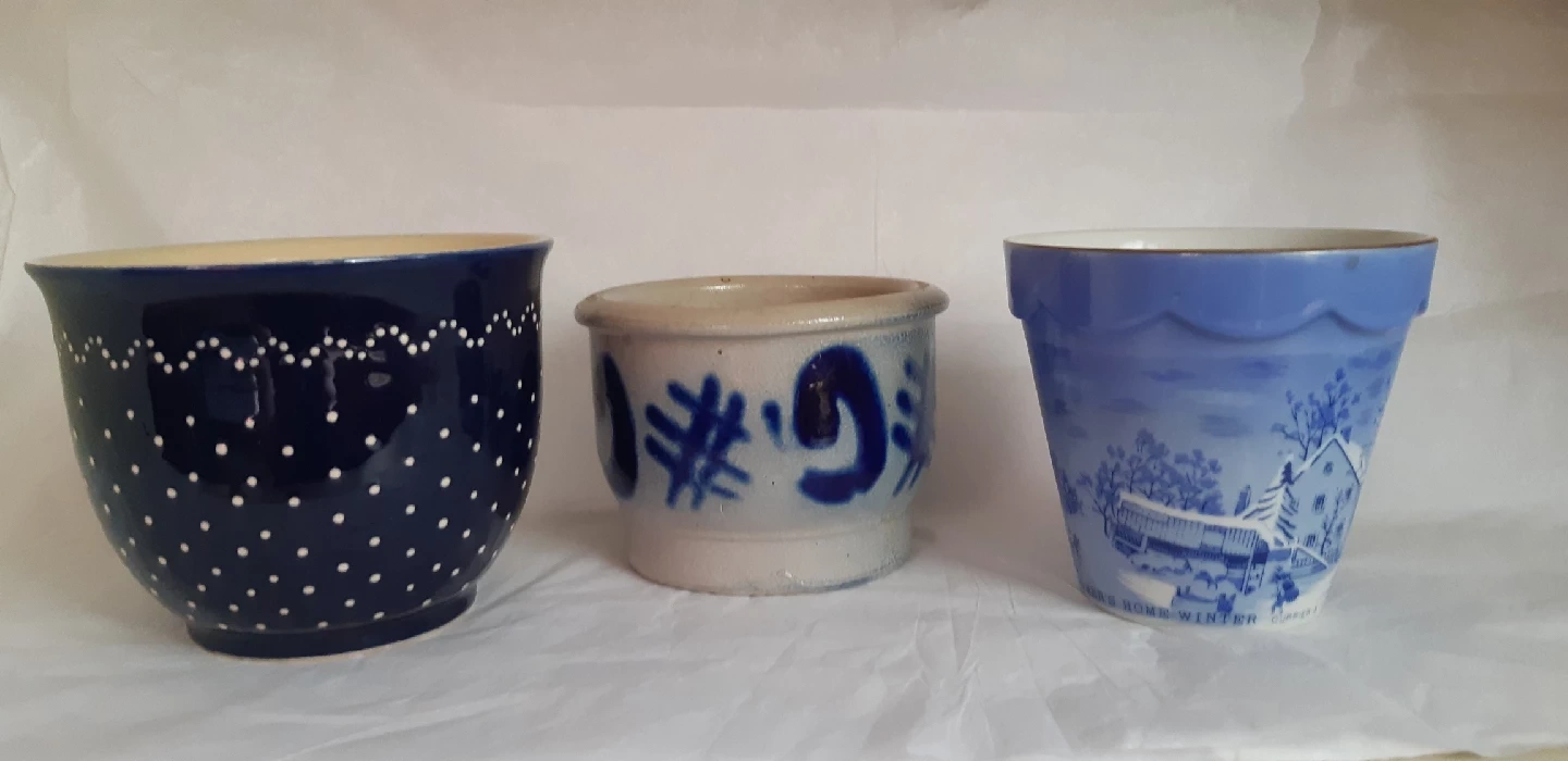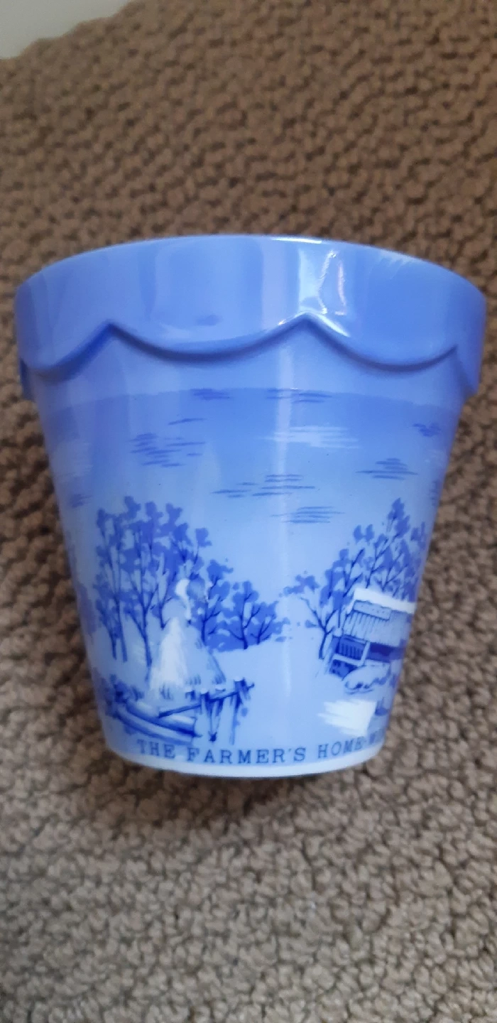 3. Vintage blue and white pottery with a handpainted scene... The image is "The Farmer's House in Winter" (produced by Currier & Ives).