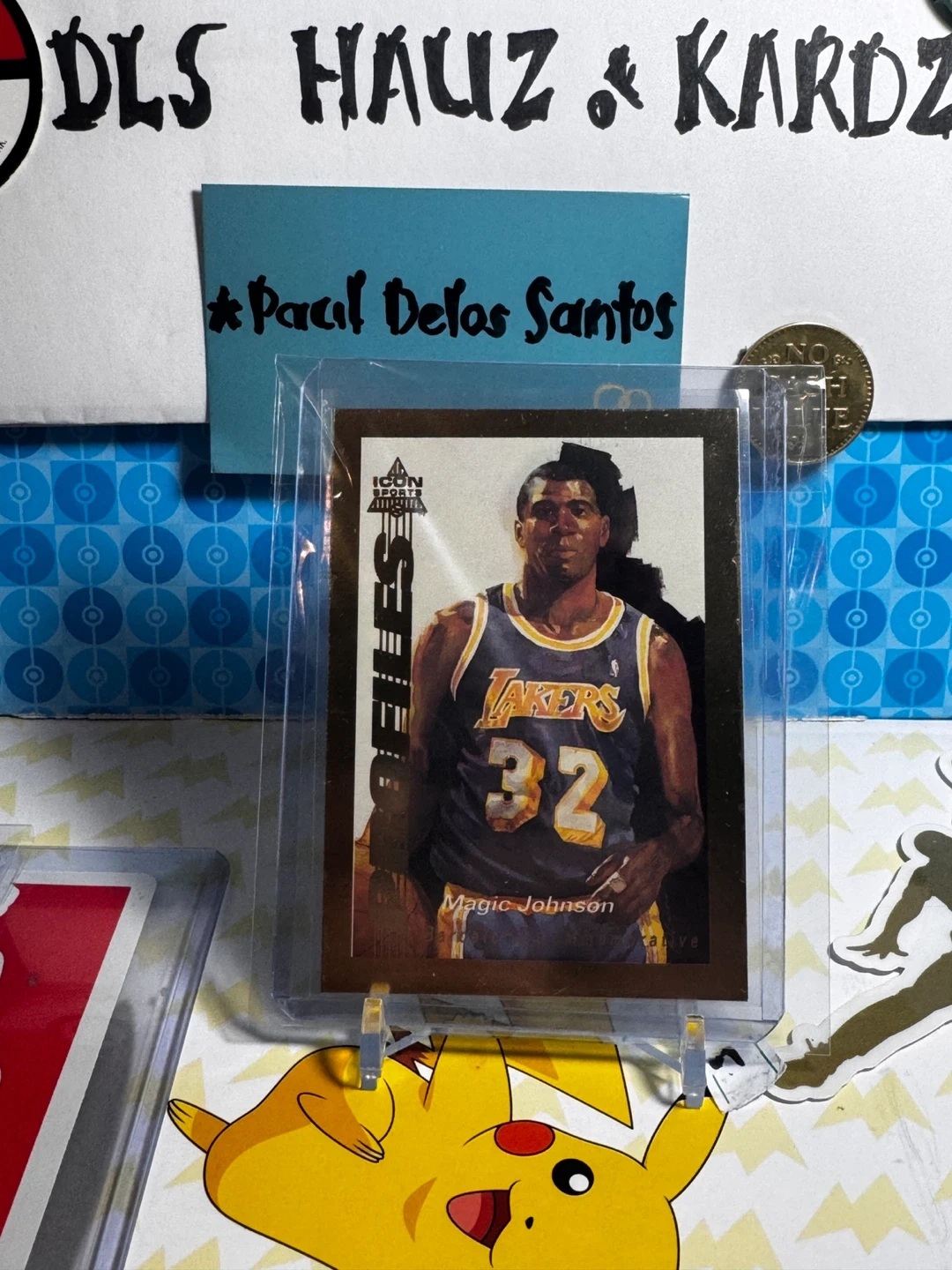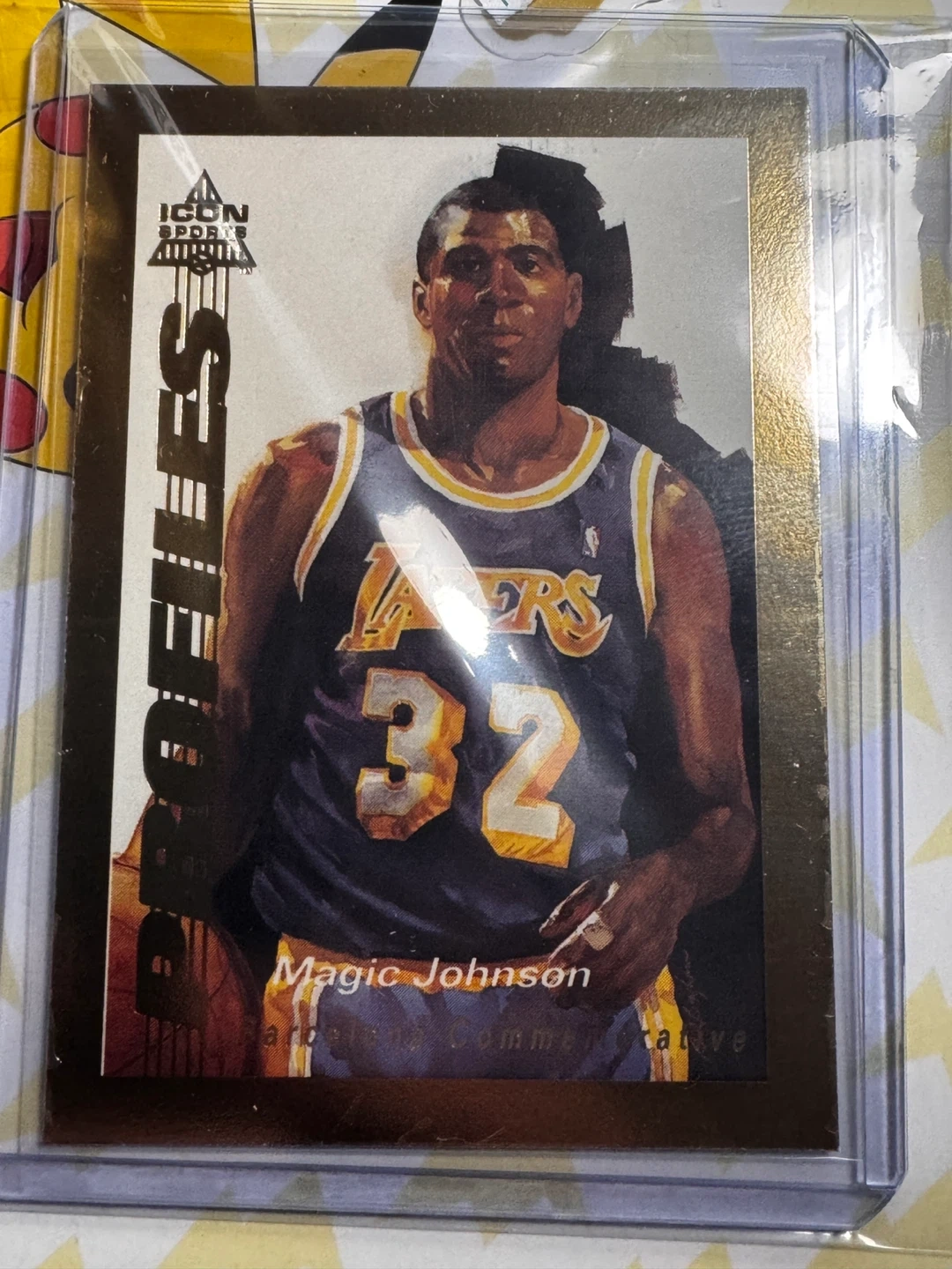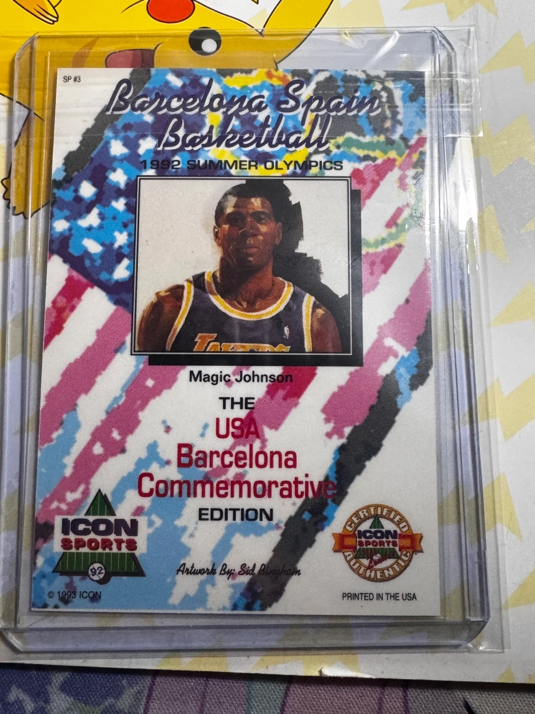 This is a 1992 Icon Sports Magic Johnson basketball card from the Barcelona Olympics "USA Barcelona Commemorative Edition". The card features artwork by Sid Binghan and is certified authentic.