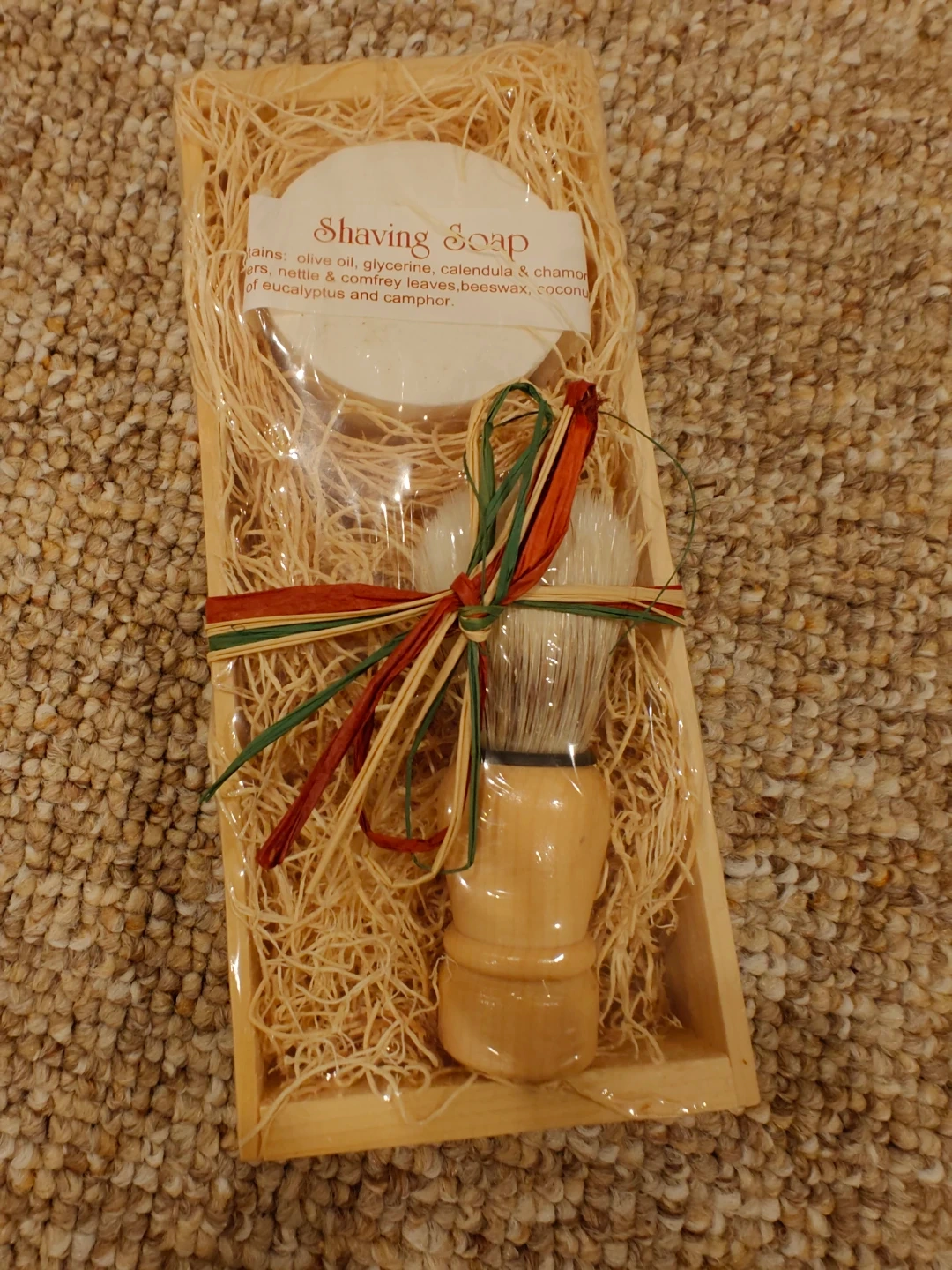 Shaving soap set with a wooden handle brush. Soap contains olive oil, glycerine, calendula, chamomile, nettle, comfrey leaves, beeswax, and coconut oil with eucalyptus and camphor. Great for a traditional wet shave!