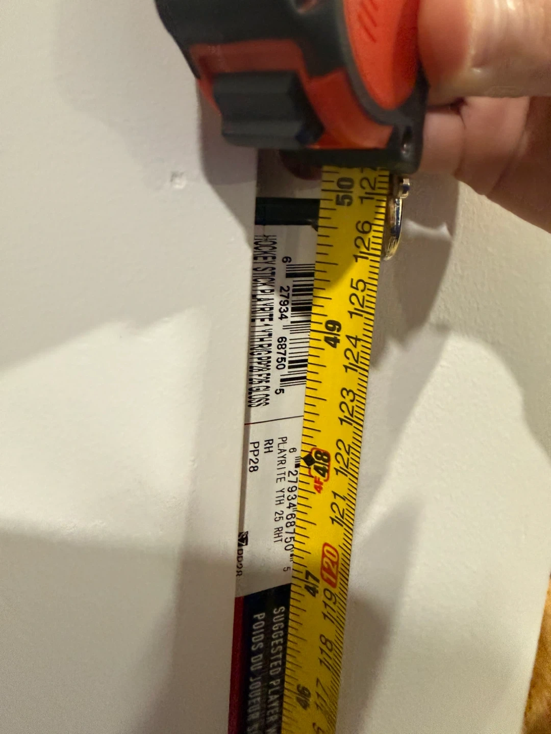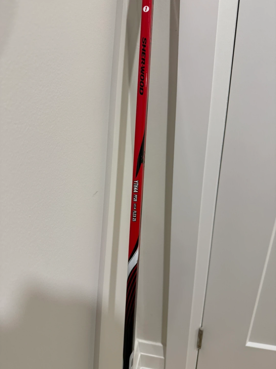 Sherwood Yth44 Hyper Lite hockey stick in red and black. Model number YTH44 HYP LITE 25 is visible. Features Playrite technology. 50 inches tall