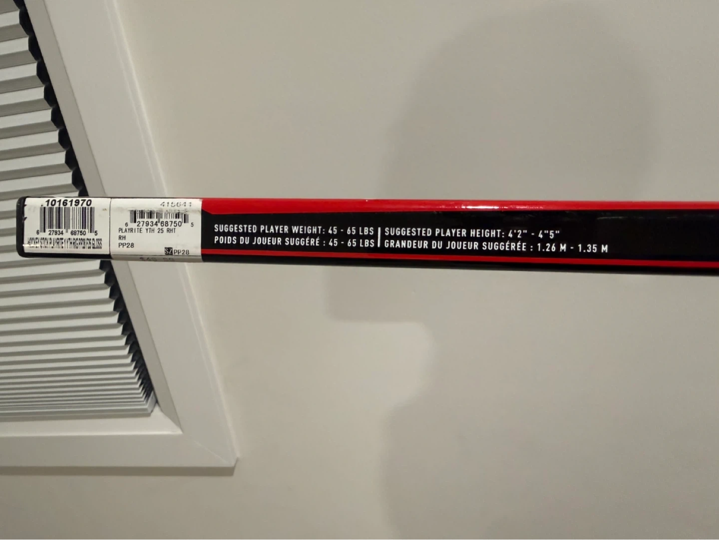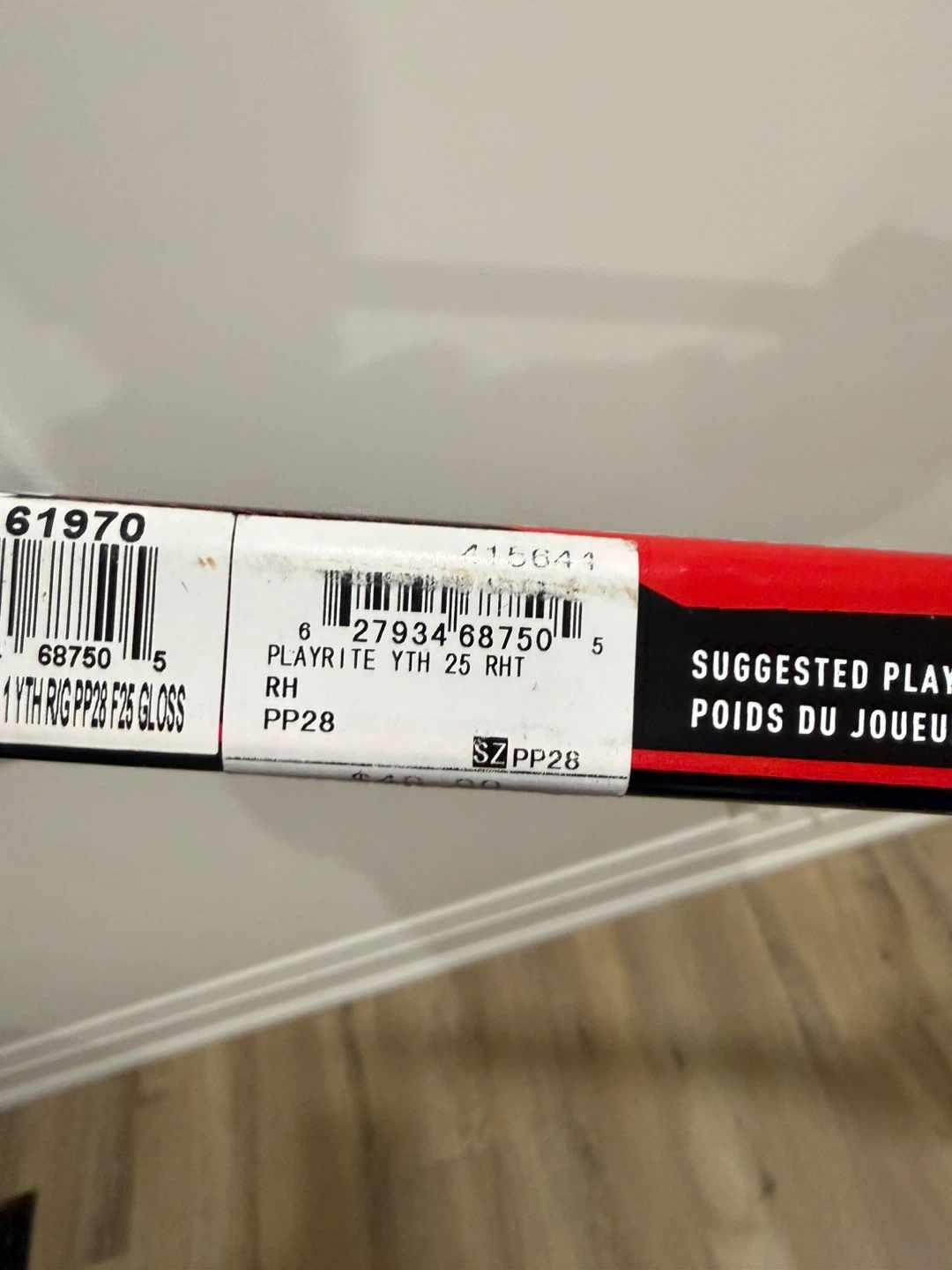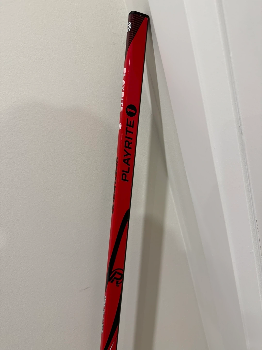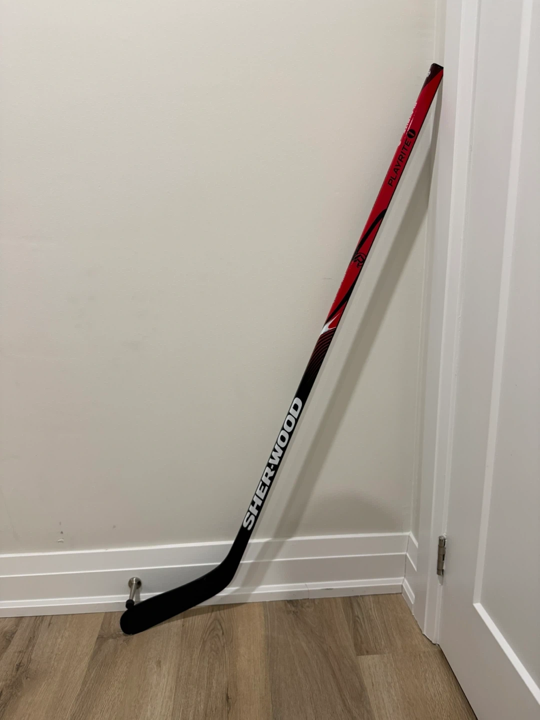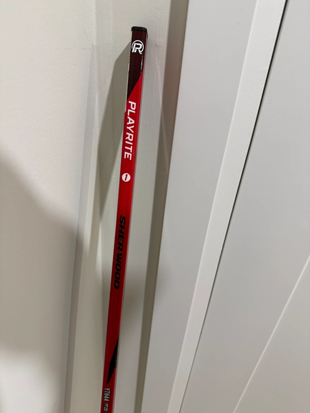 Sherwood Yth44 Hyper Lite hockey stick in red and black. Model number YTH44 HYP LITE 25 is visible. Features Playrite technology. 50 inches tall