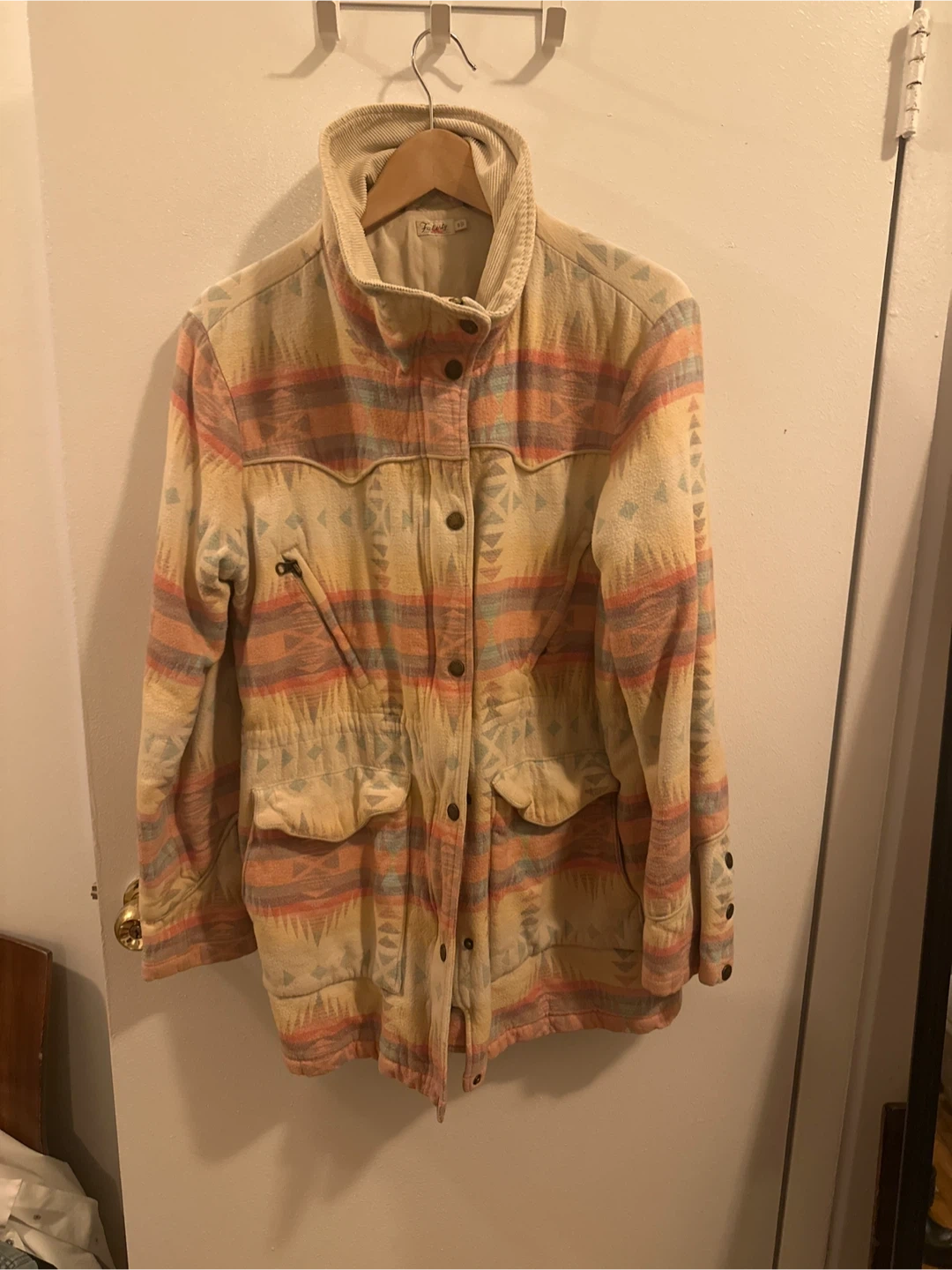 Here's a Tolani jacket with a unique Aztec print! It's in good condition and ready for a new owner. The jacket features a corduroy collar and a full button front. Perfect for adding a pop of color and pattern to your wardrobe!