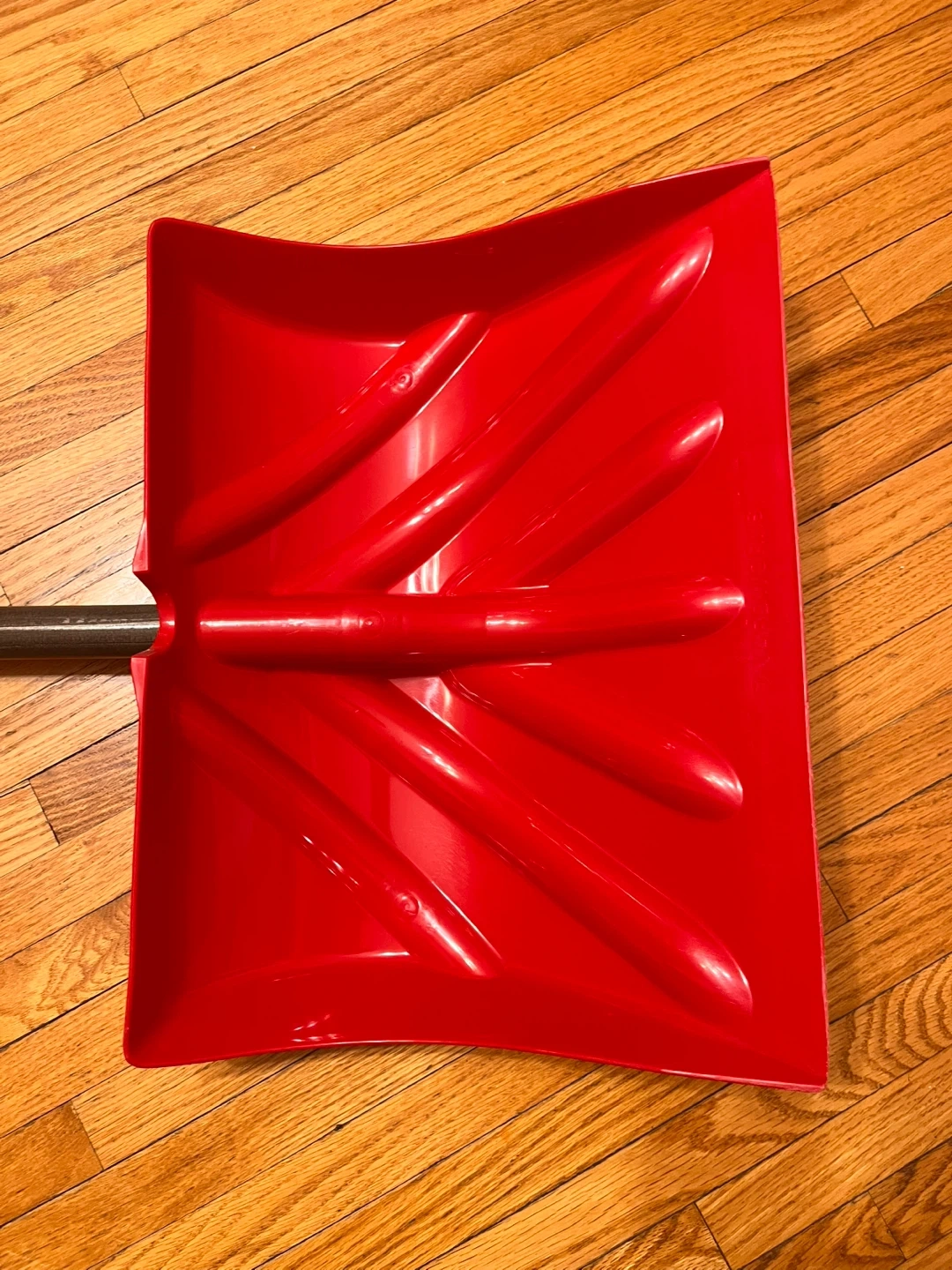This red snow shovel features a durable plastic blade and a sturdy metal handle with a comfortable grip. It's perfect for clearing snow this winter. The shovel has a wide blade to move more snow with each scoop.