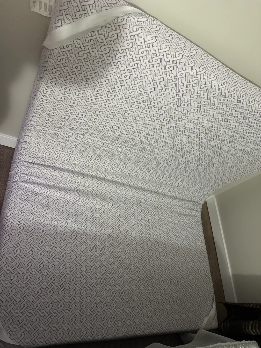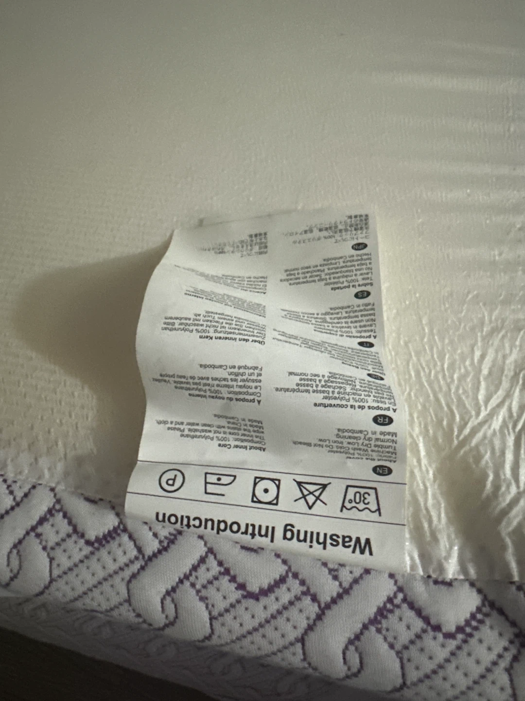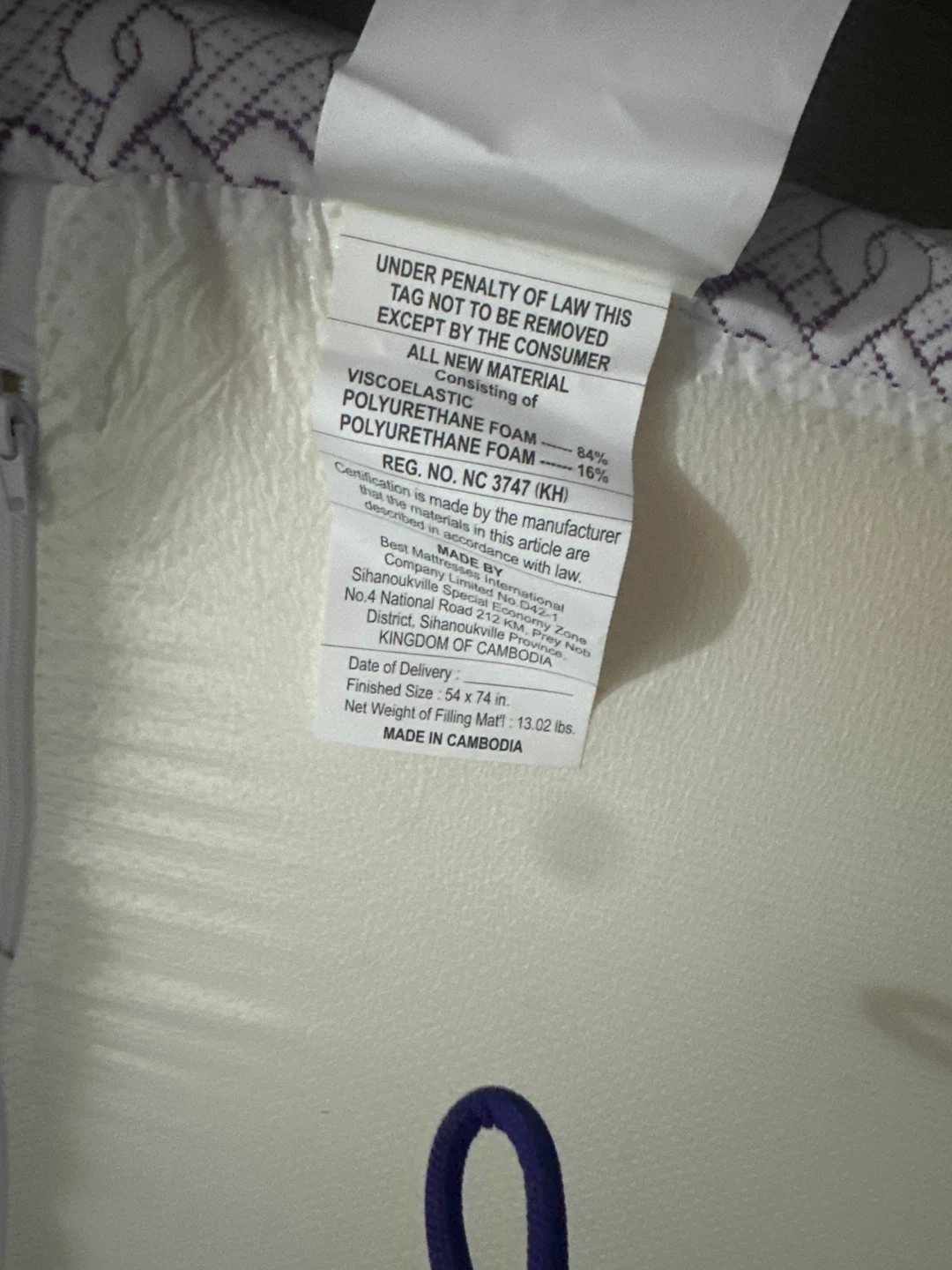 This mattress topper is made with Visco Elastic Polyurethane Foam and standard Polyurethane Foam. It's 54 x 74 inches and weighs 13.02 lbs. Care instructions include do not wash, do not iron, and dry clean only.
