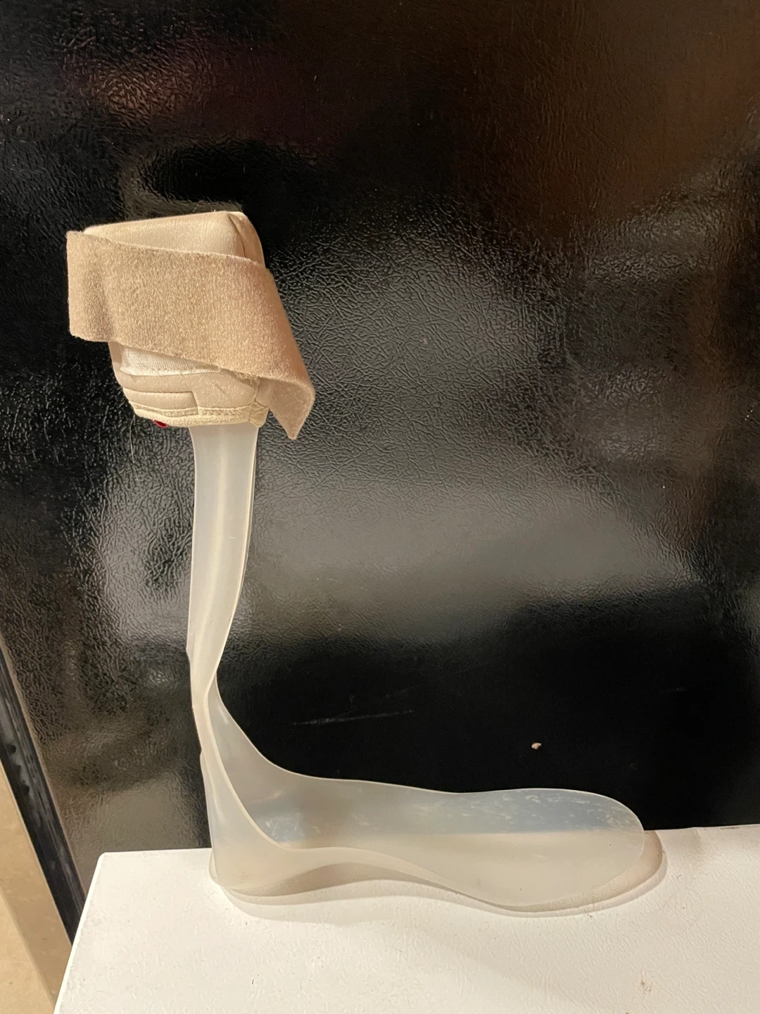 It's made of a clear plastic material with a padded ankle strap. This brace is typically used to help with mobility and stability due to drop foot.