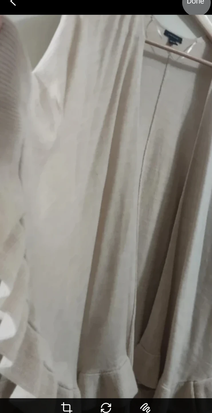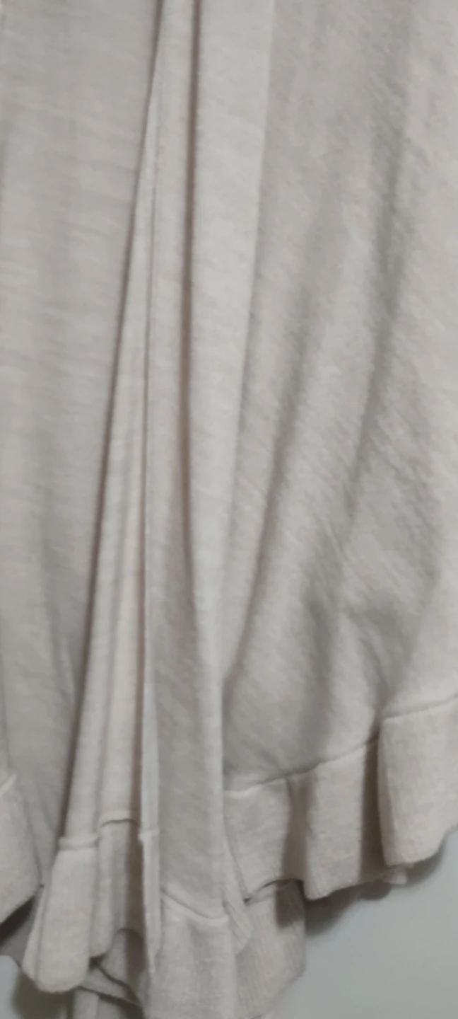 Here's a comfy shawl from Ann Taylor. It's a one-size-fits-all piece, perfect for layering. The material is soft and the ruffled hem adds a touch of elegance.