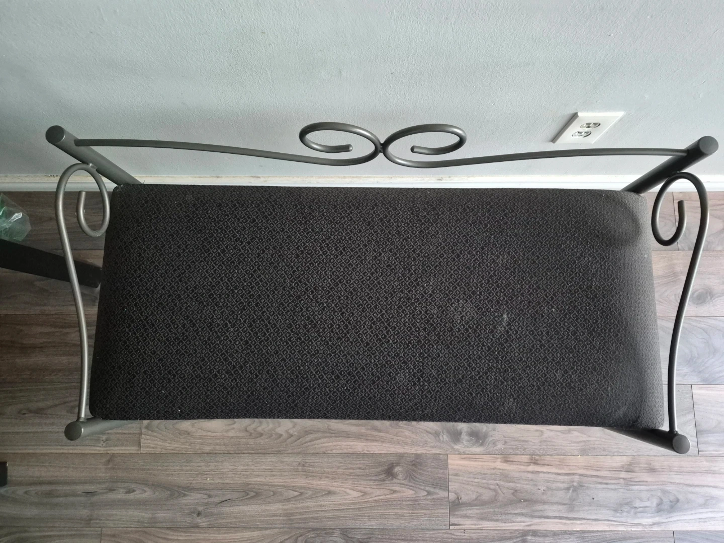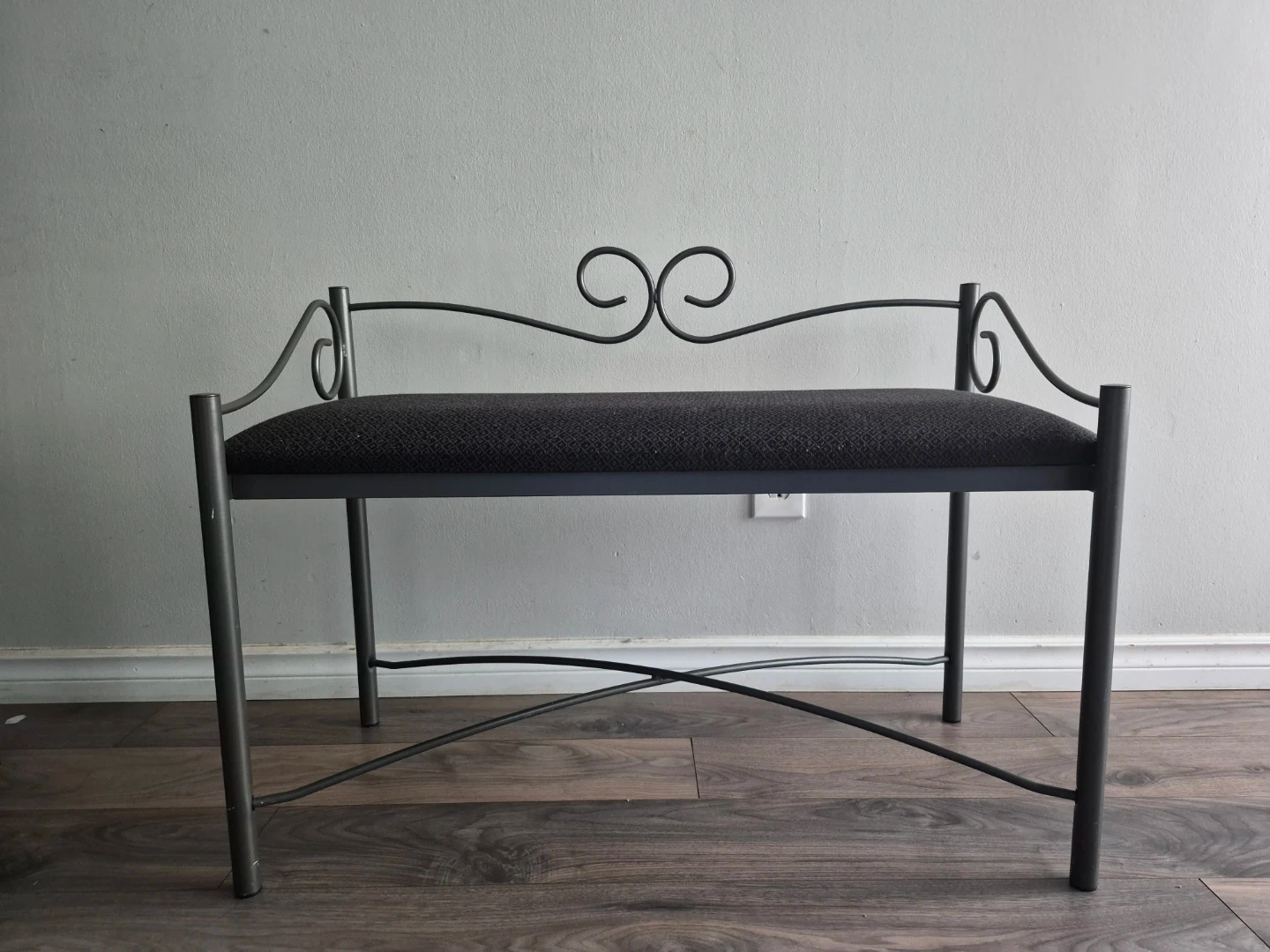 This is a sturdy metal bench with a dark grey upholstered seat. It has decorative scrollwork on the backrest. It's suitable for entryways or as extra seating.