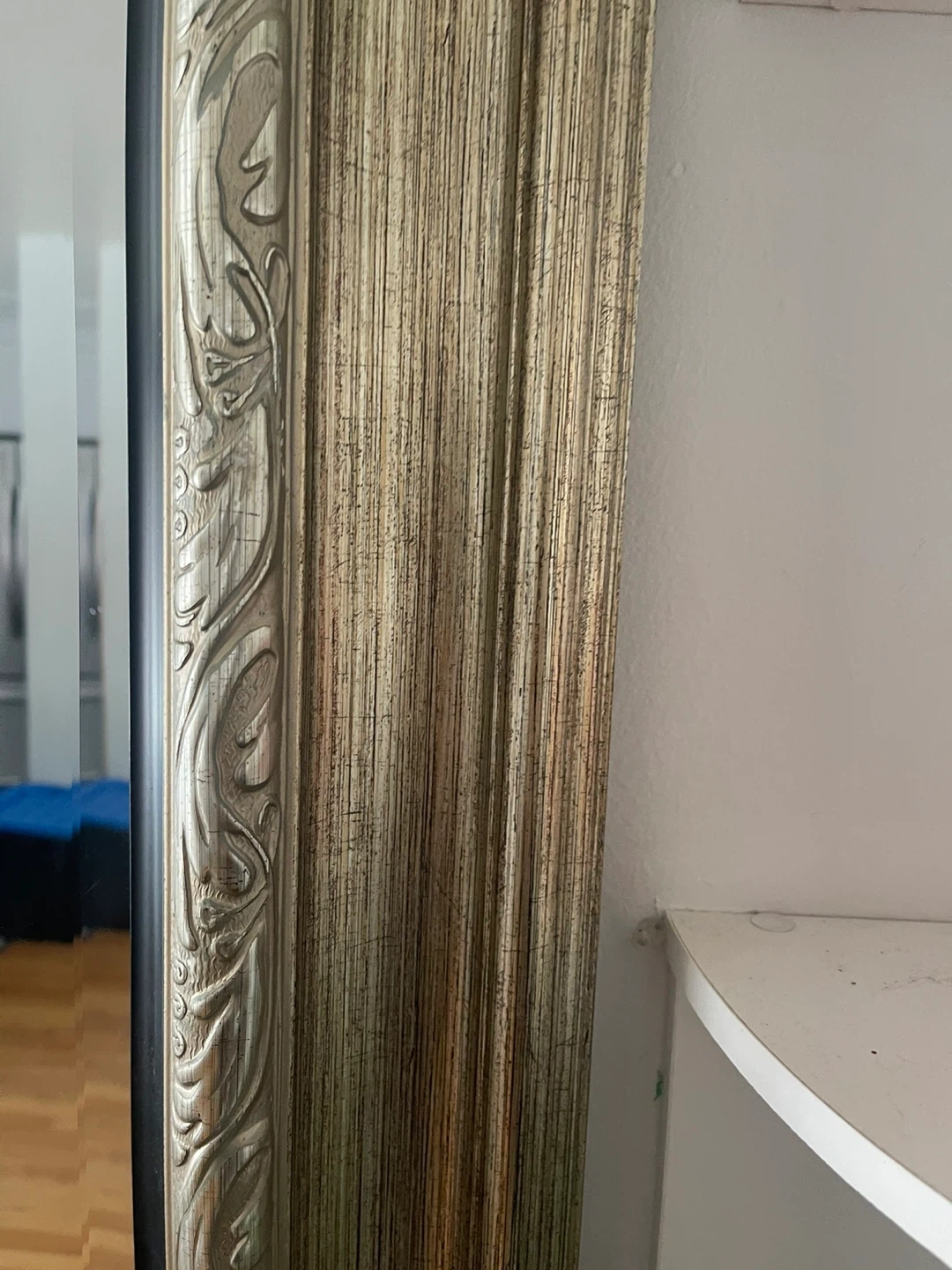 A large, full-length mirror with an ornate gold-coloured frame. The frame has a detailed carved design with a distressed finish. It's perfect for checking your outfit before heading out. Size: 39 inches x 93 inches
