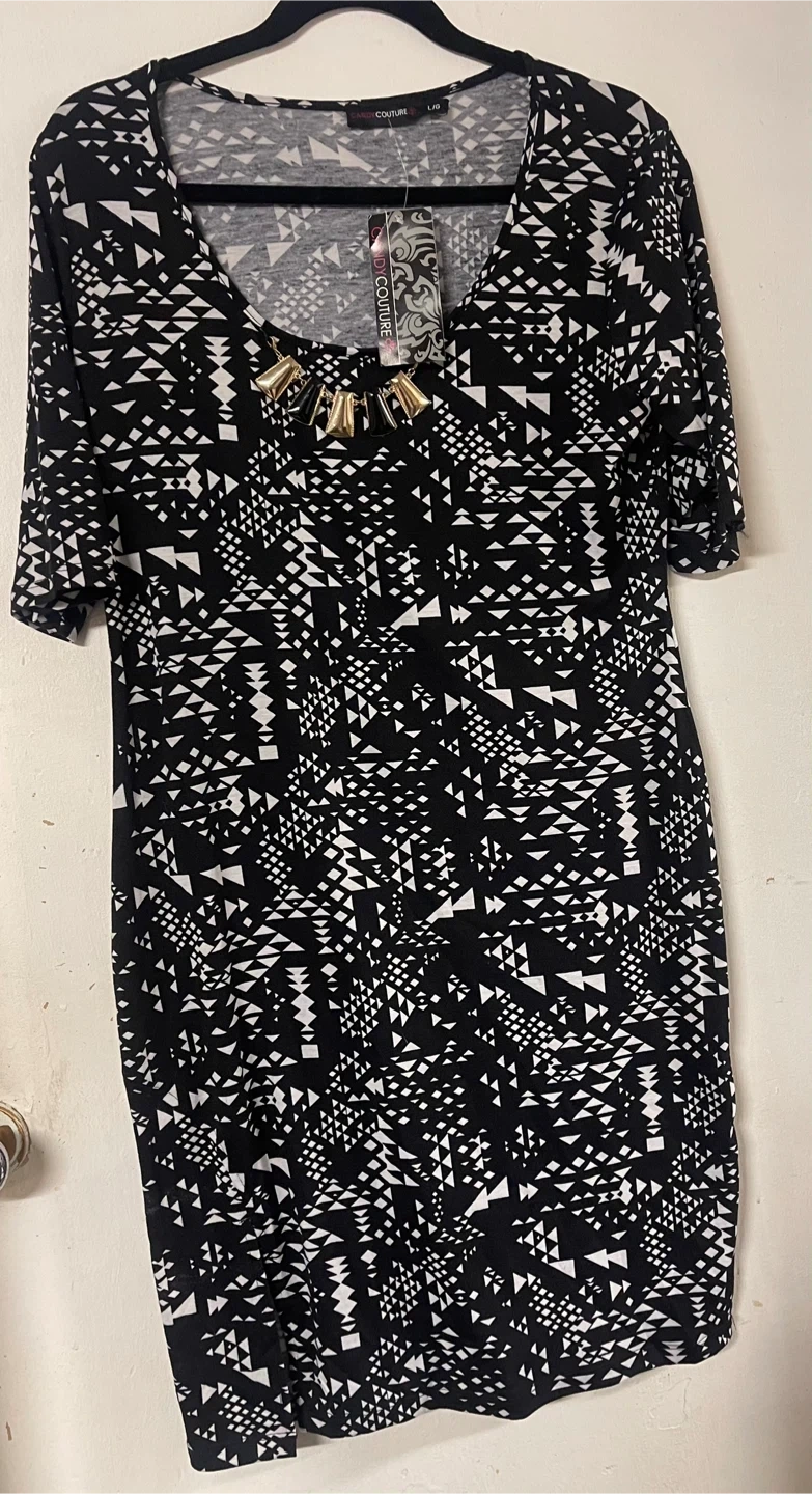 Item Details: Black and white geometric patterned dress. It has a scoop neckline with a decorative gold and black -tone accent. Material is stretchy.