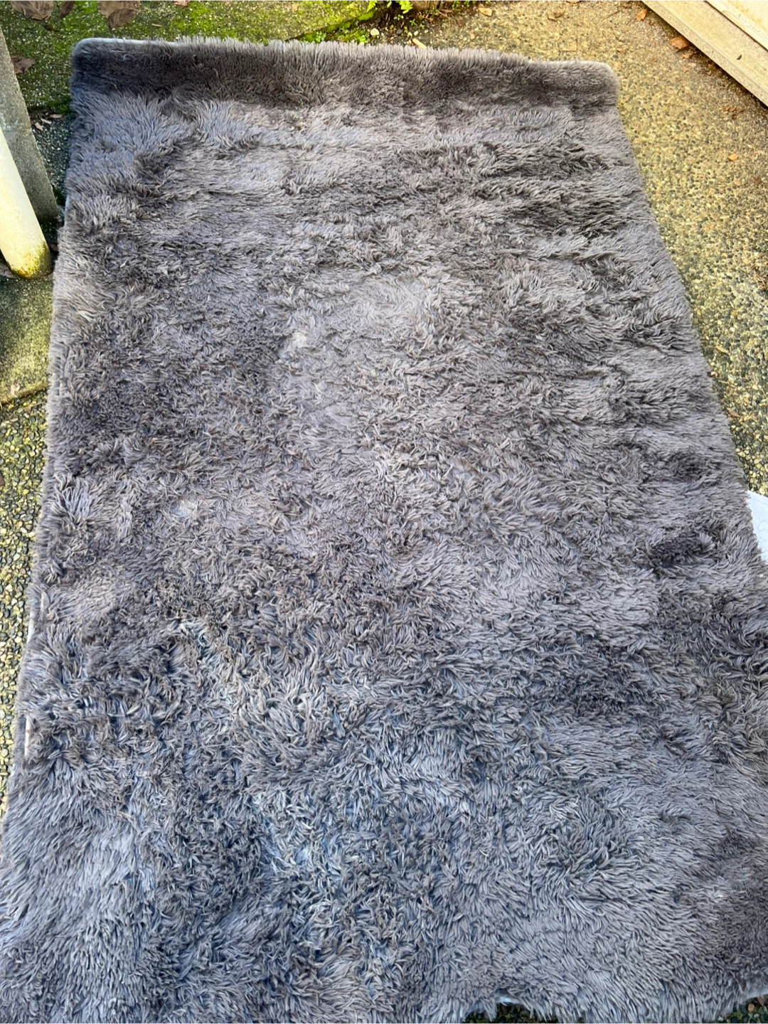 A soft and fluffy shag rug. It's a nice grey colour and would add comfort to any room. The rug is a decent size for a living room or bedroom. It's great for adding warmth underfoot!