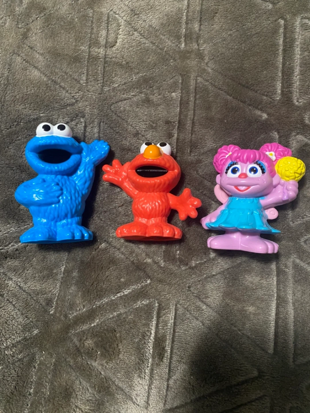 Selling 3 Sesame Street Workshop toy figures. Made of plastic. Approx 3” tall each. New condition. No box. Includes Cookie Monster, Elmo and Abby Caddaby.