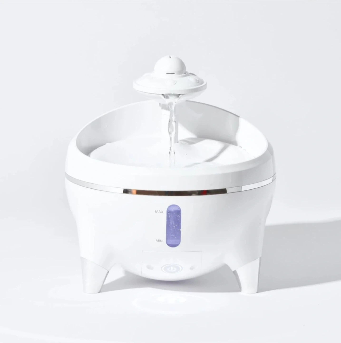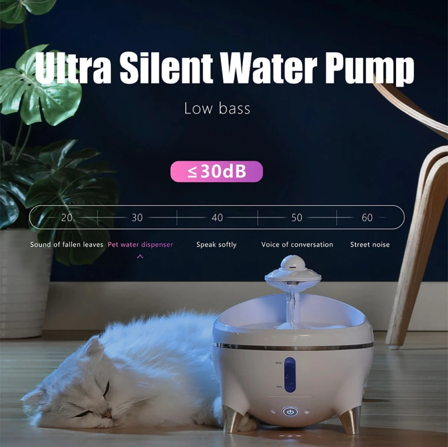 This automatic water fountain is designed for cats. It features a catnip ball to increase interest in drinking water. The outlet water level is adjustable for different cat sizes. It also has an ultraviolet component to sterilize the water flow. The pump is ultra silent, operating at less than 30dB.