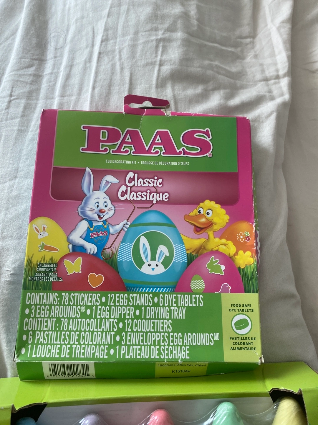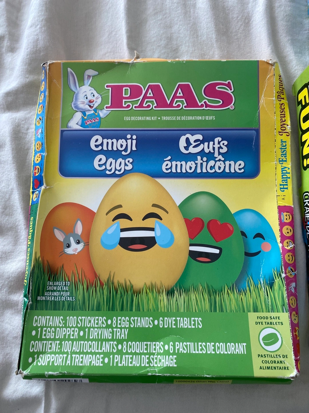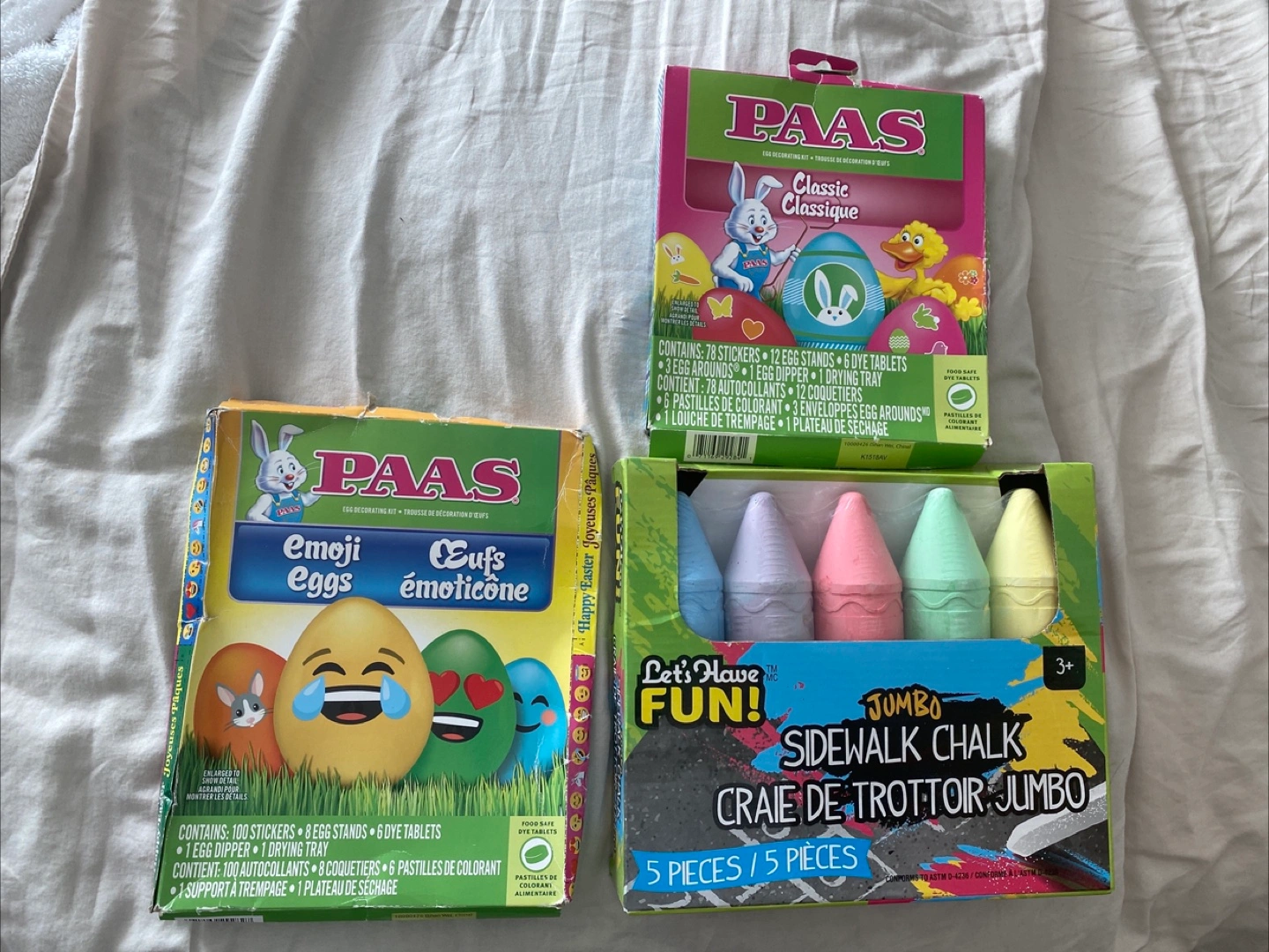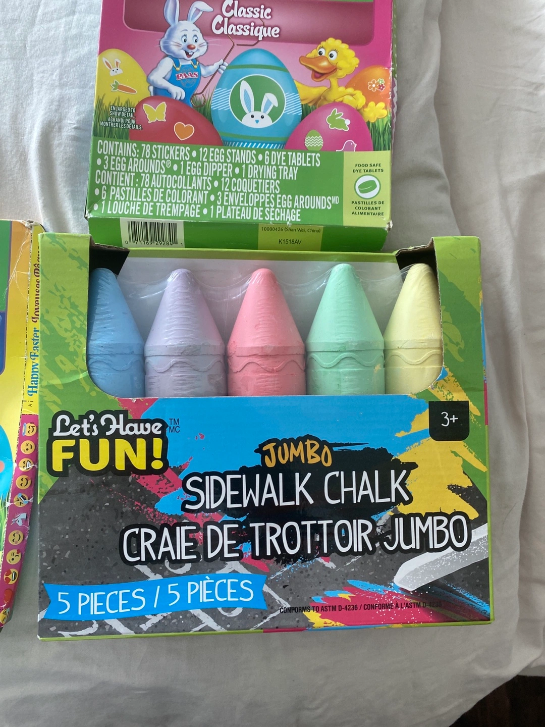 Selling a set of sidewalk chalk and PAAS egg decorating kits! The chalk is jumbo sized and comes with 5 pieces. There are two different PAAS kits available for decorating Easter eggs. One is a classic kit and the other is an emoji kit. Everything for $5. New but box a little bent.