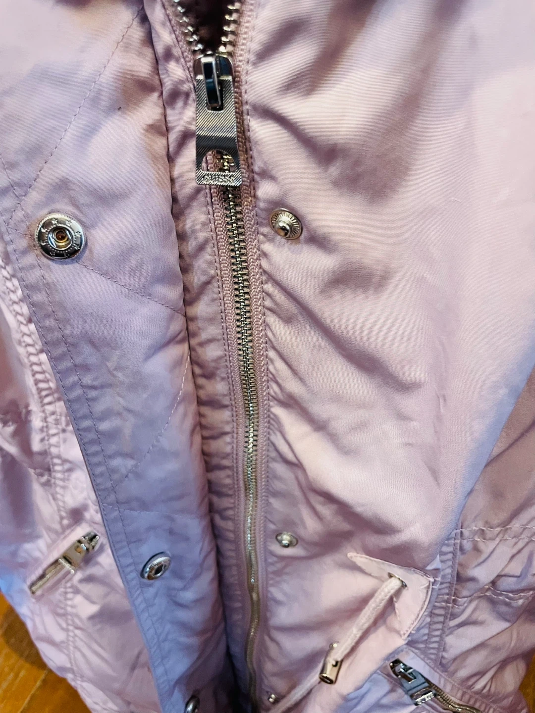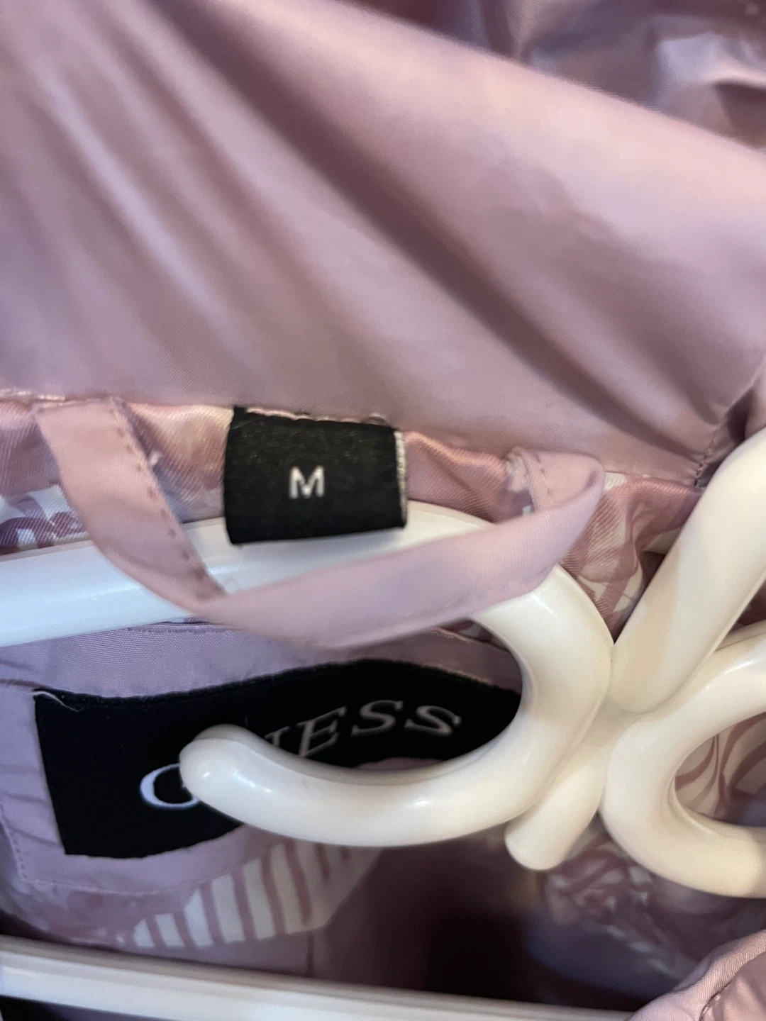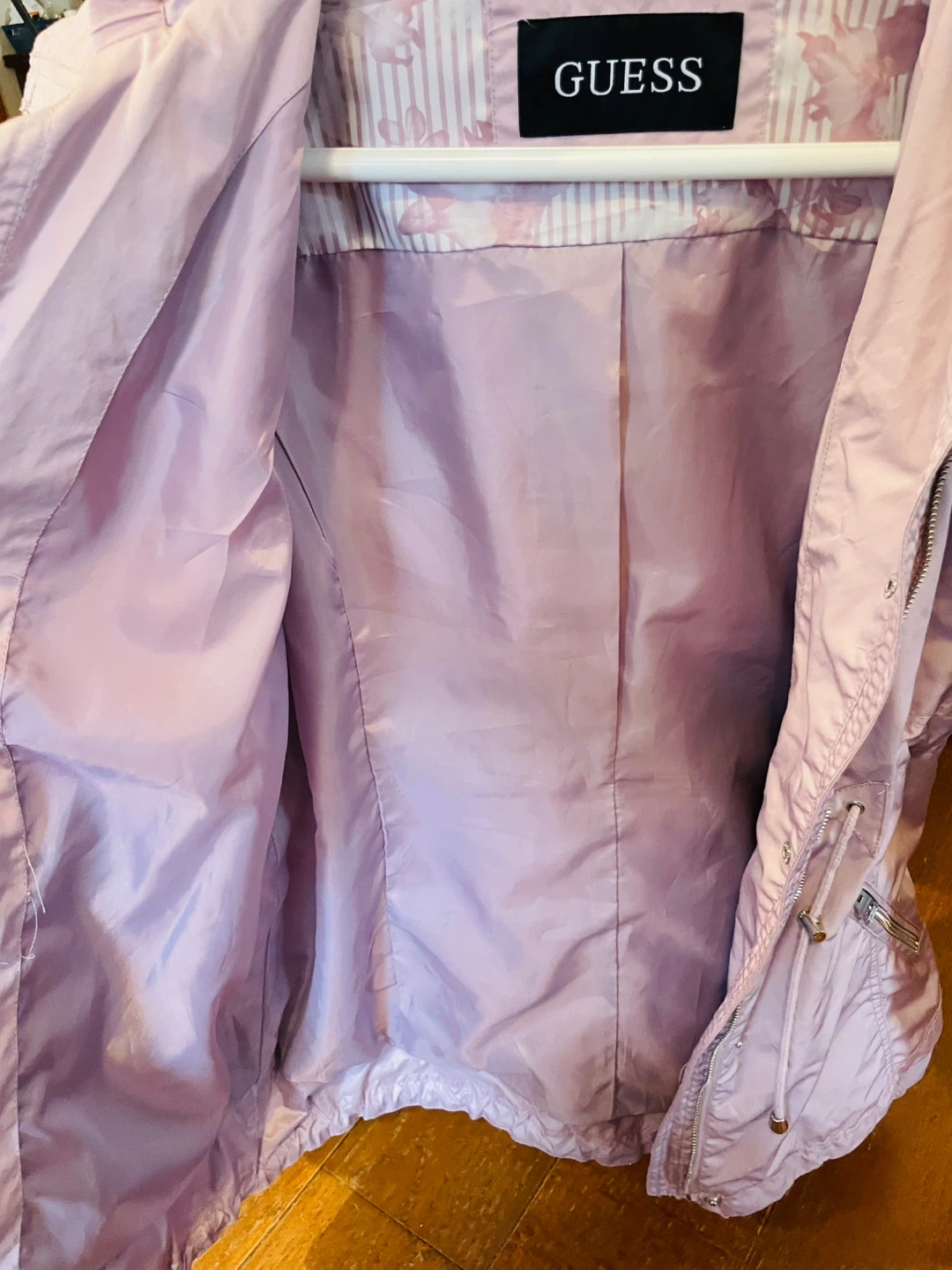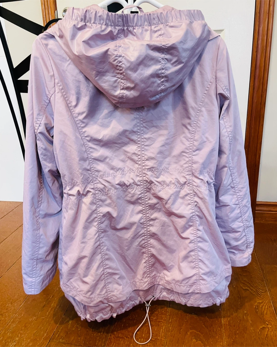 Selling a gently used Guess rain jacket in a lovely lavender colour. It's a size medium and features a hood, zipper and button closure, and drawstring at the waist. Perfect for that cool spring weather or those rainy days!