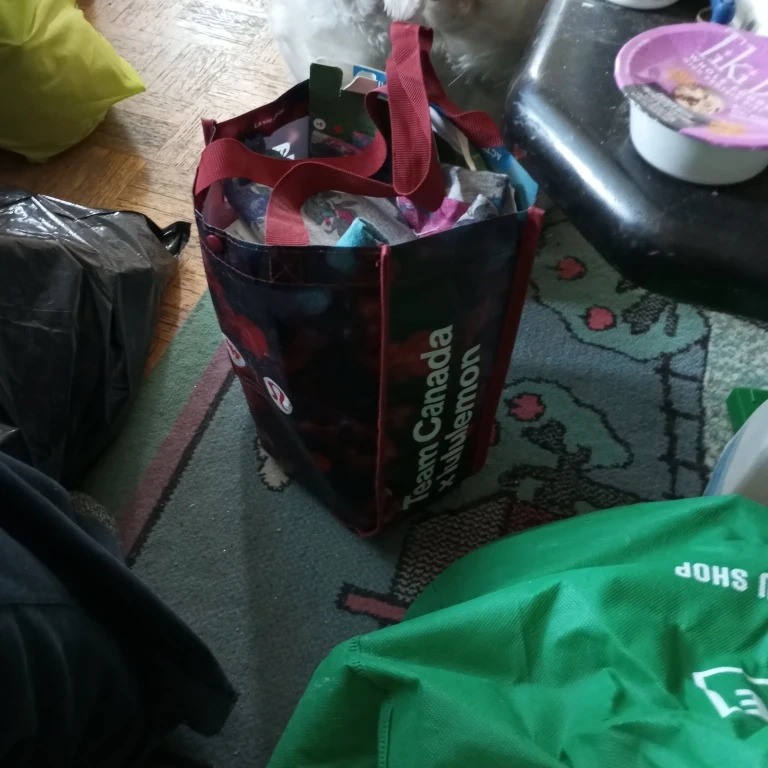 This bundle includes a variety of items, featuring a LEGO Super Heroes set and a Lululemon Team Canada tote bag. You'll also find Joe Fresh socks, a Life Brand Cold + Sinus Plus box, and other small packaged goods. It's a great collection of everyday essentials and fun items!