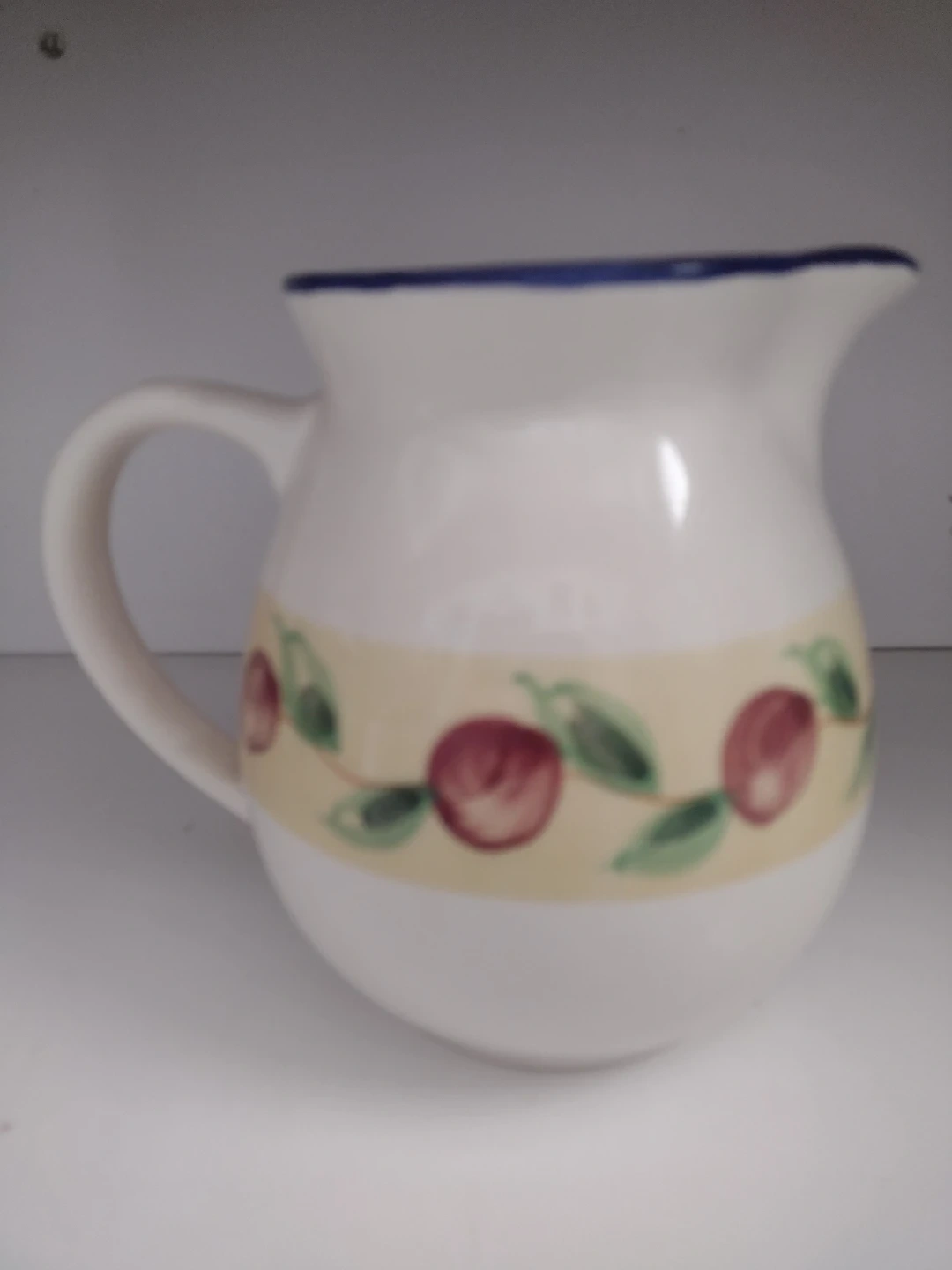 This ceramic pitcher has a charming fruit and leaf design. It features a white base with a decorative band and a blue rim. It's a lovely addition to any kitchen.