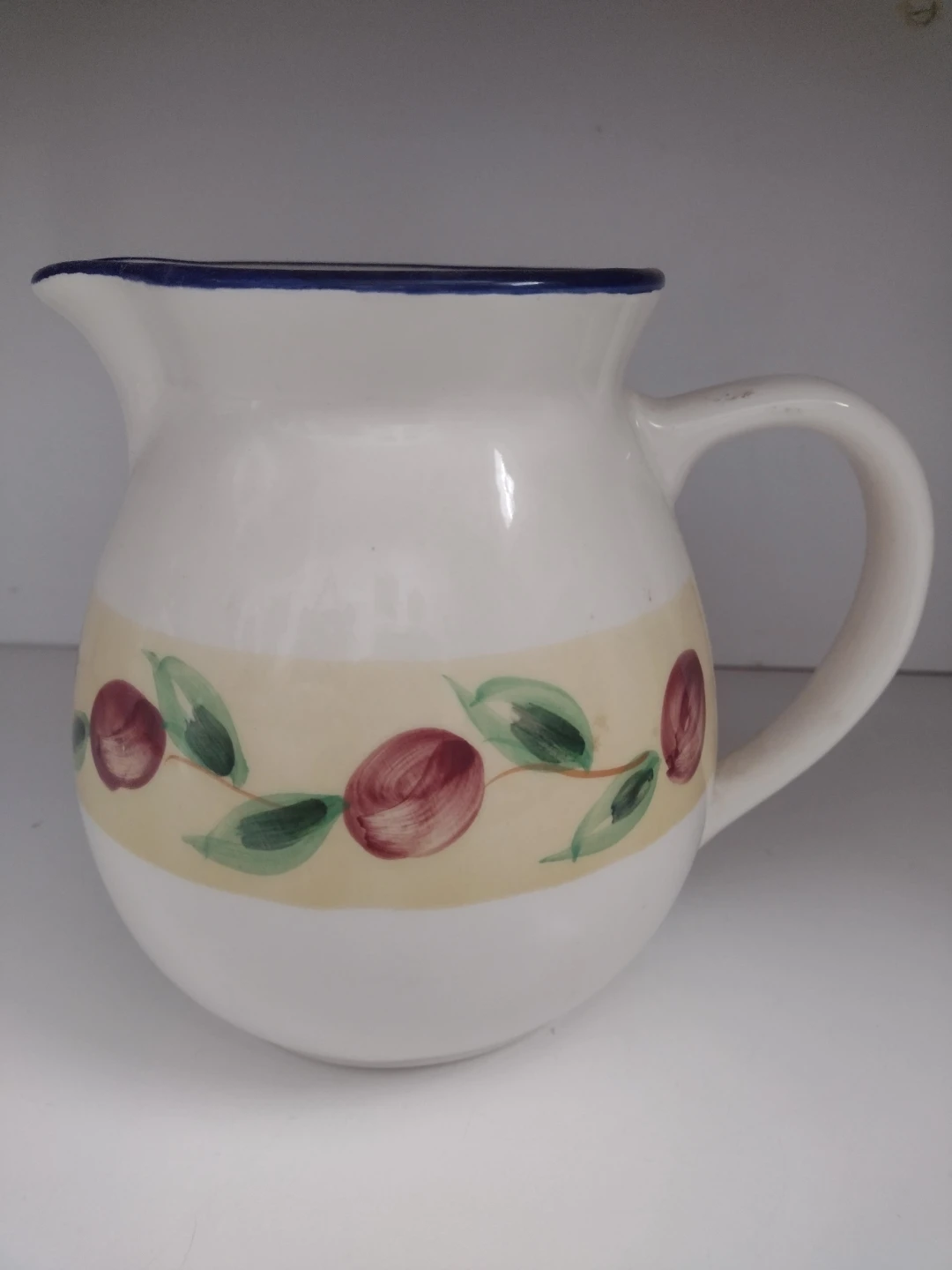 This ceramic pitcher has a charming fruit and leaf design. It features a white base with a decorative band and a blue rim. It's a lovely addition to any kitchen.