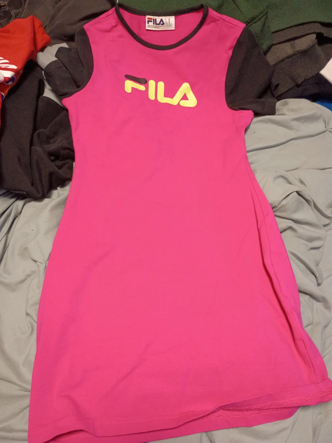 This is a Fila dress with a bright pink body and dark grey sleeves. It has the Fila logo prominently displayed on the front in yellow. It's a comfortable and stylish piece for casual wear. This dress is great for warmer weather.