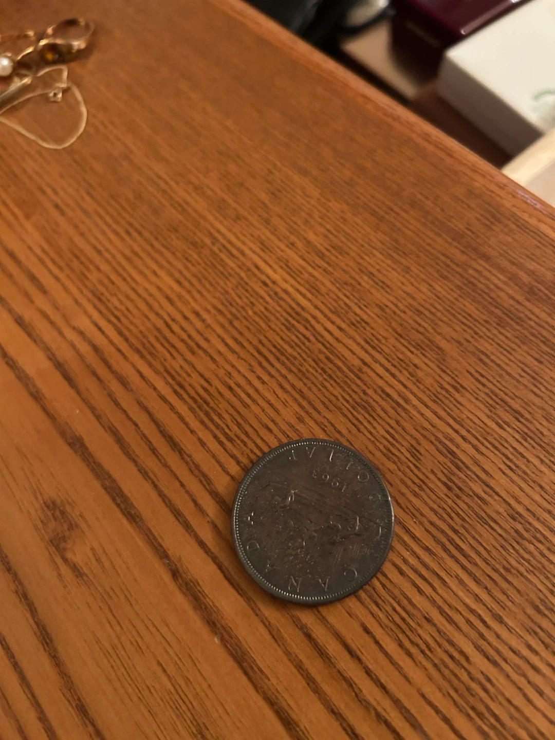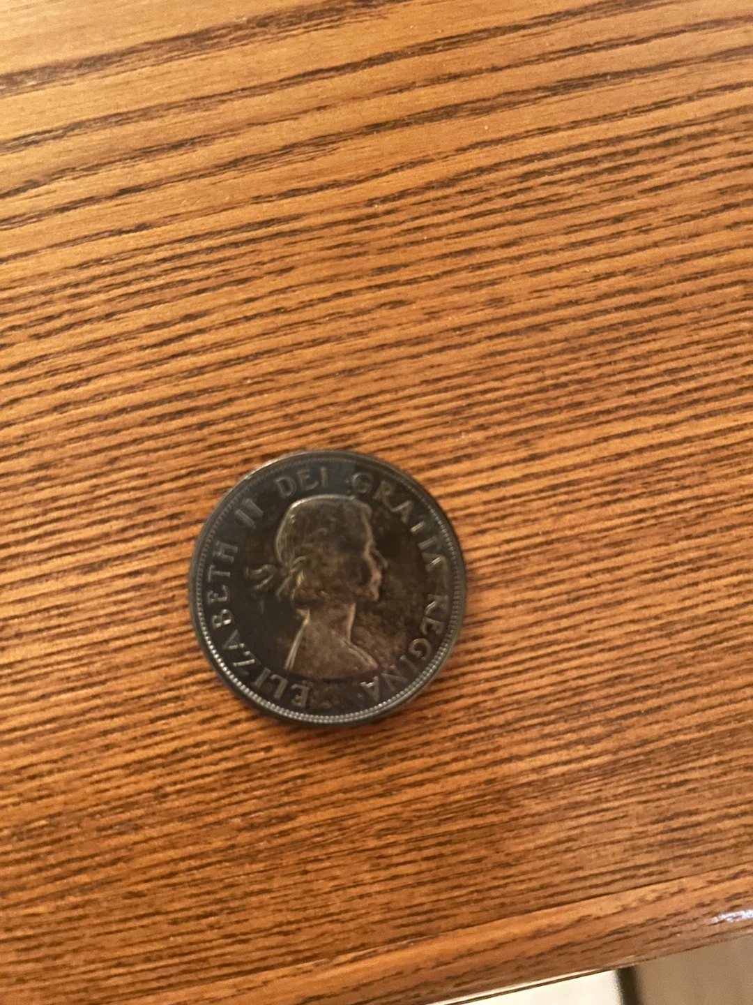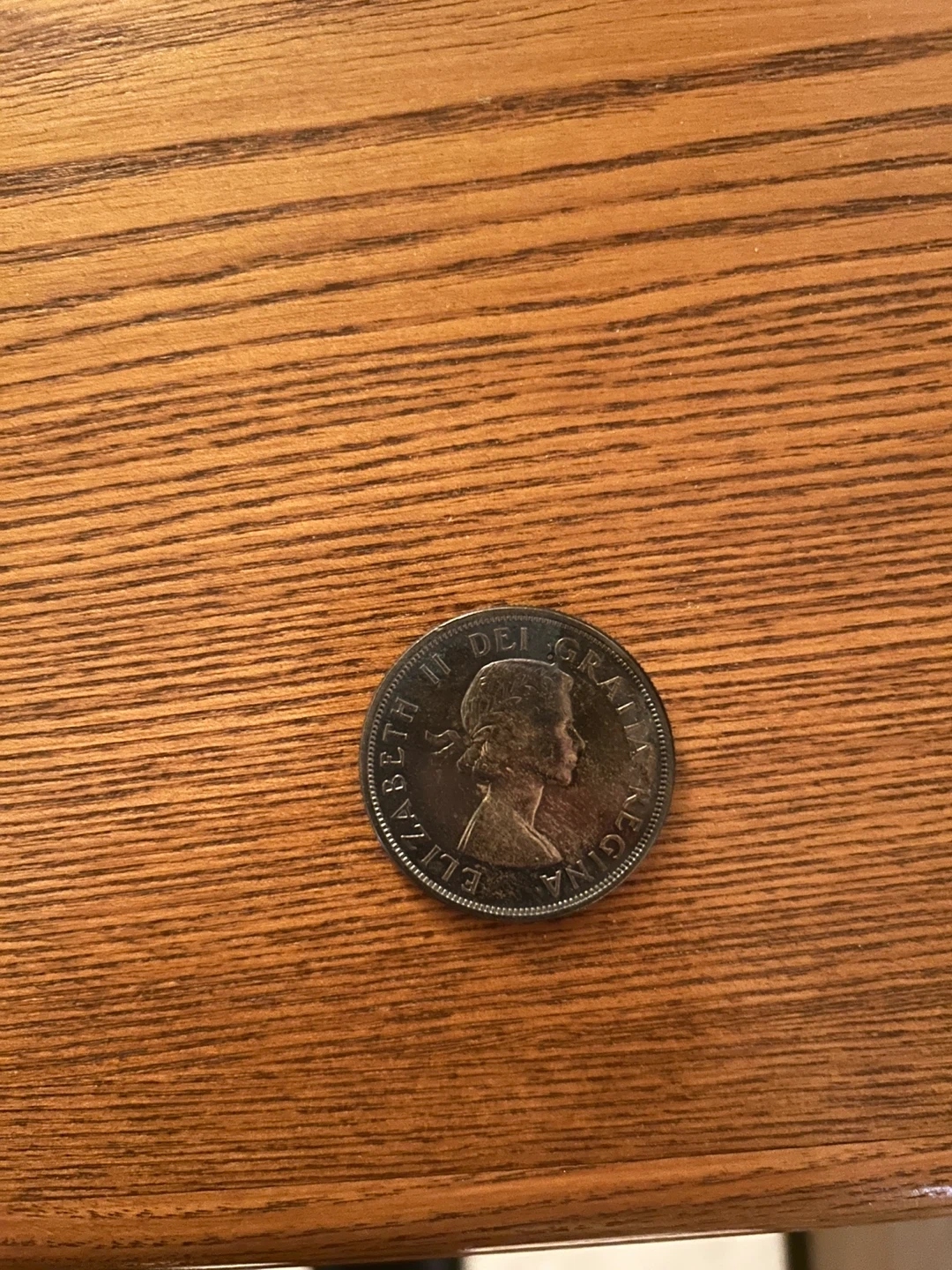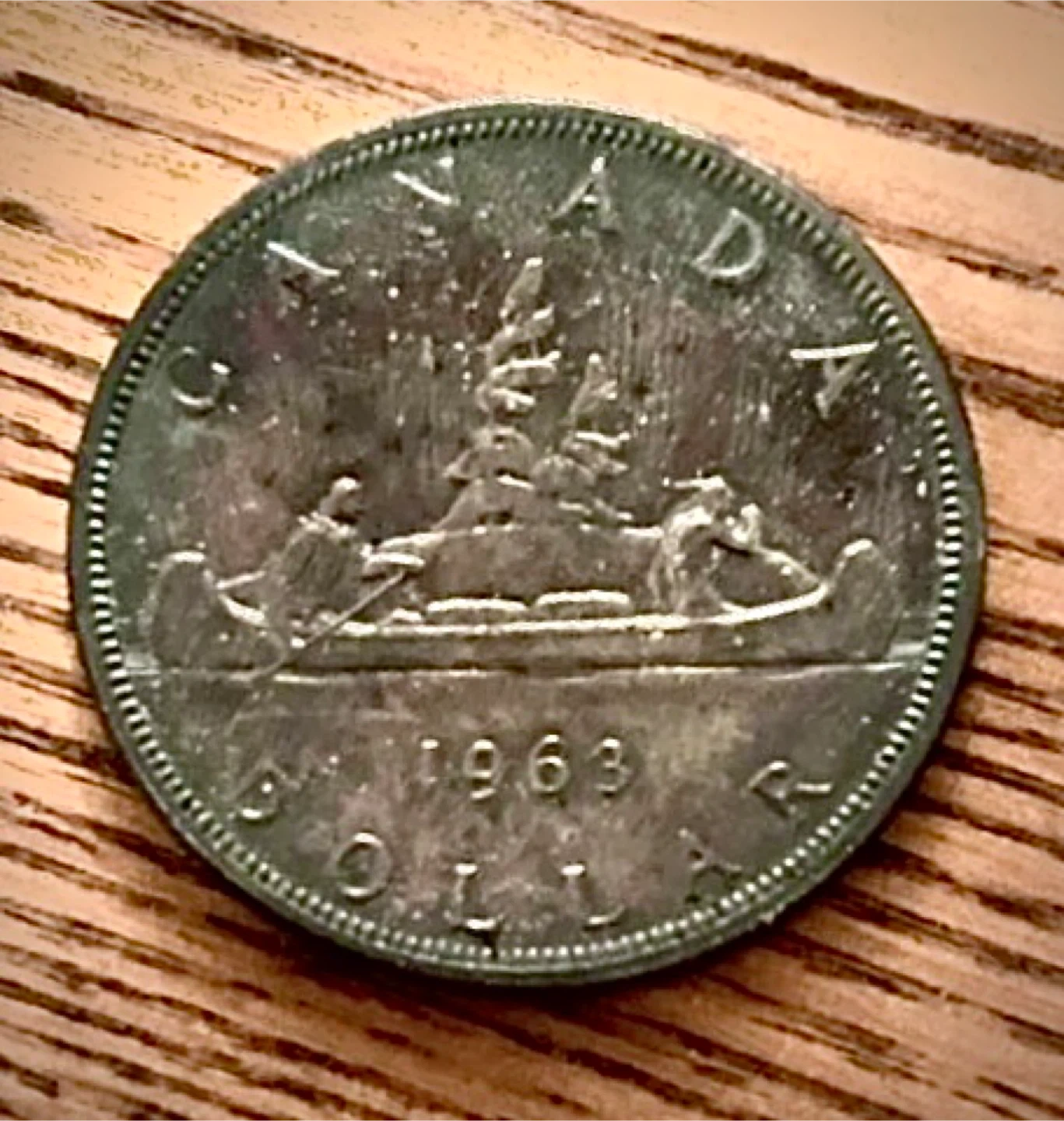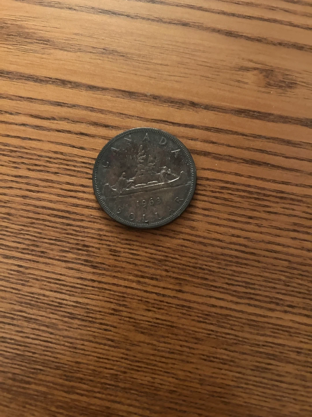 This is a Canadian silver dollar coin from 1969. It features Queen Elizabeth II on one side and a canoe scene on the other. A nice addition for any coin collector!