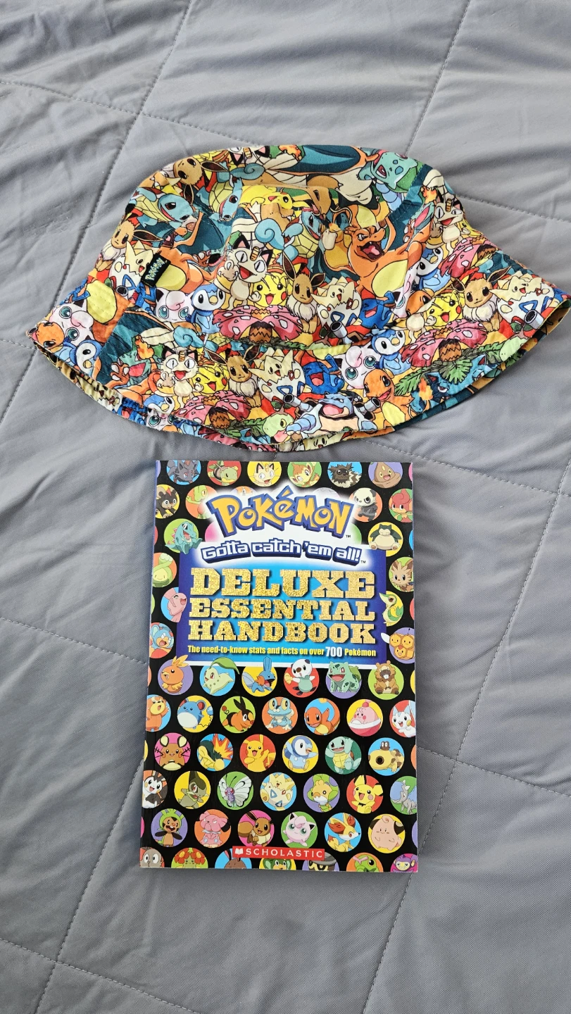 For new and seasoned Pokémon trainers. Bucket hat says for 14 and older but I would consider it a medium sized hat. Stand out next time you are playing Pokémon GO. Book is in new condition as this was a second copy relieved as a gift.