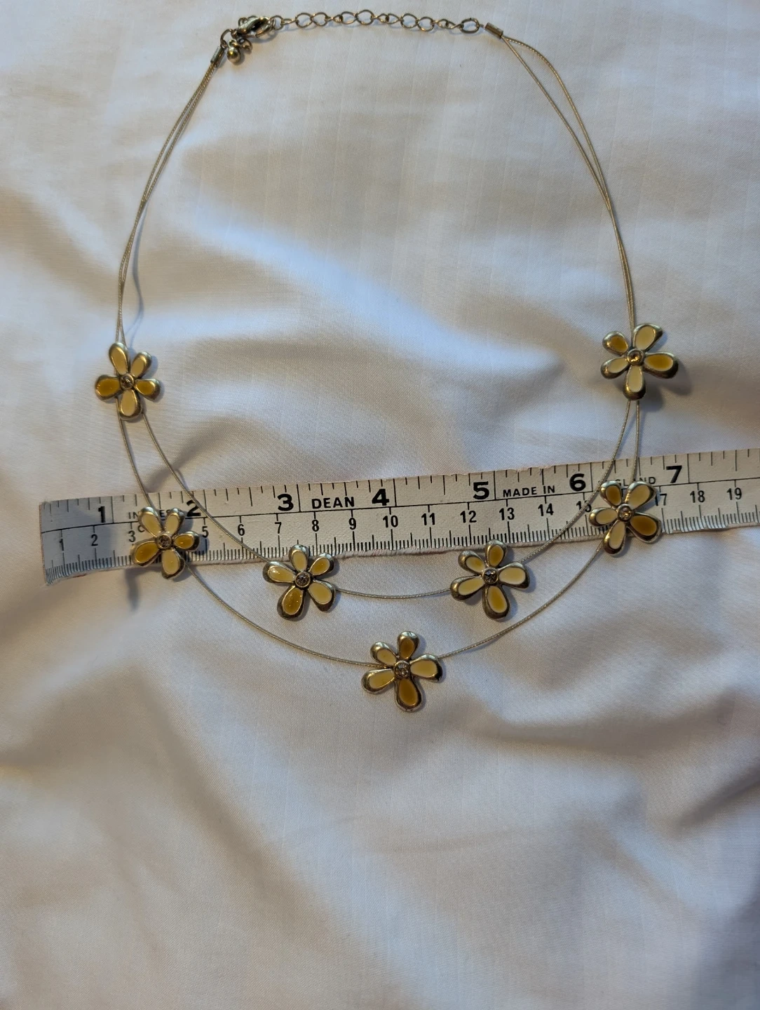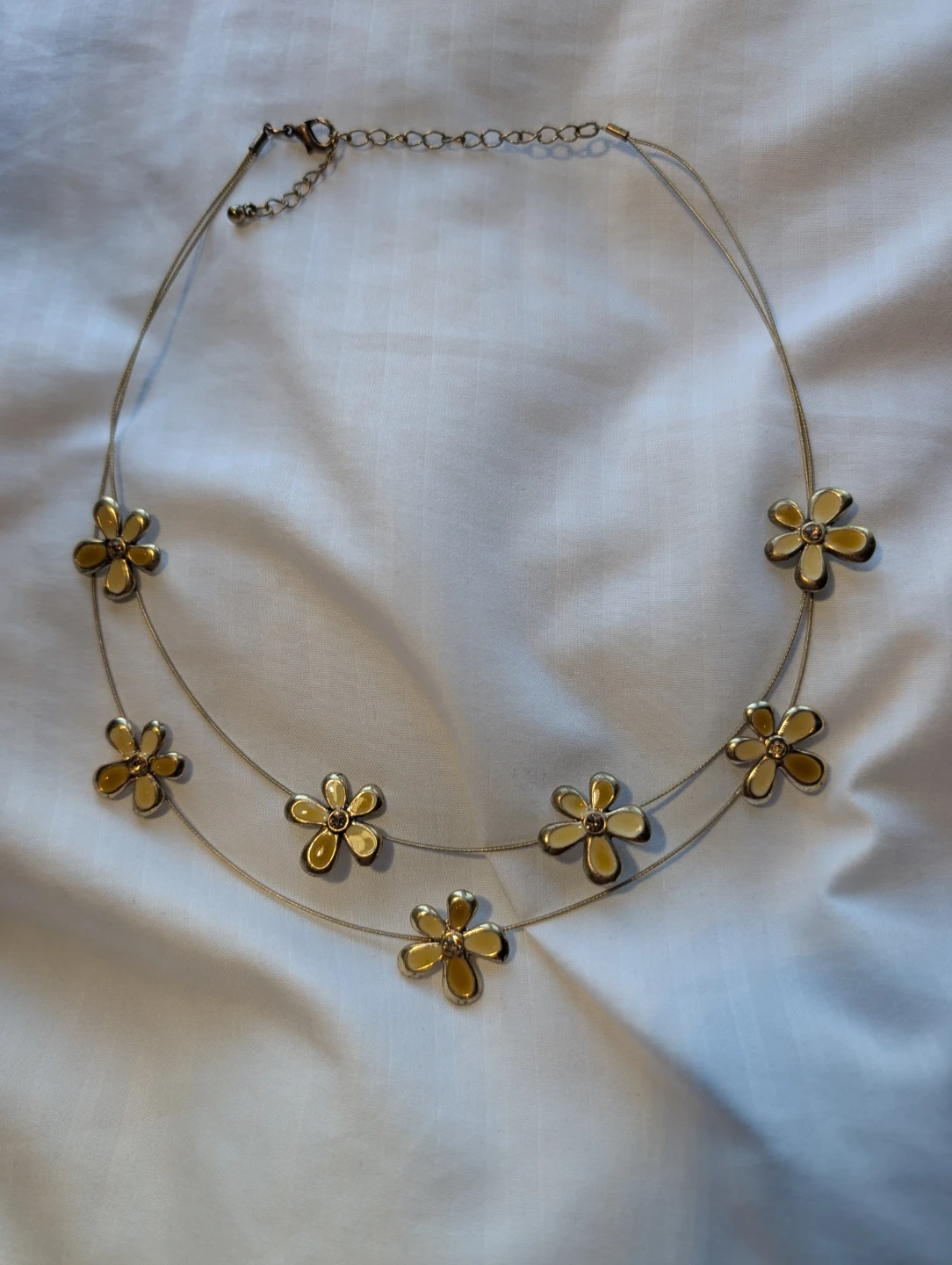 This necklace features two delicate strands adorned with small daisy-shaped charms. The overall colour is a soft gold tone, with yellow and off-white enamel detailing on the flowers. The necklace has an adjustable clasp closure for a comfortable fit. It's a lovely accessory for adding a touch of floral charm to any outfit!