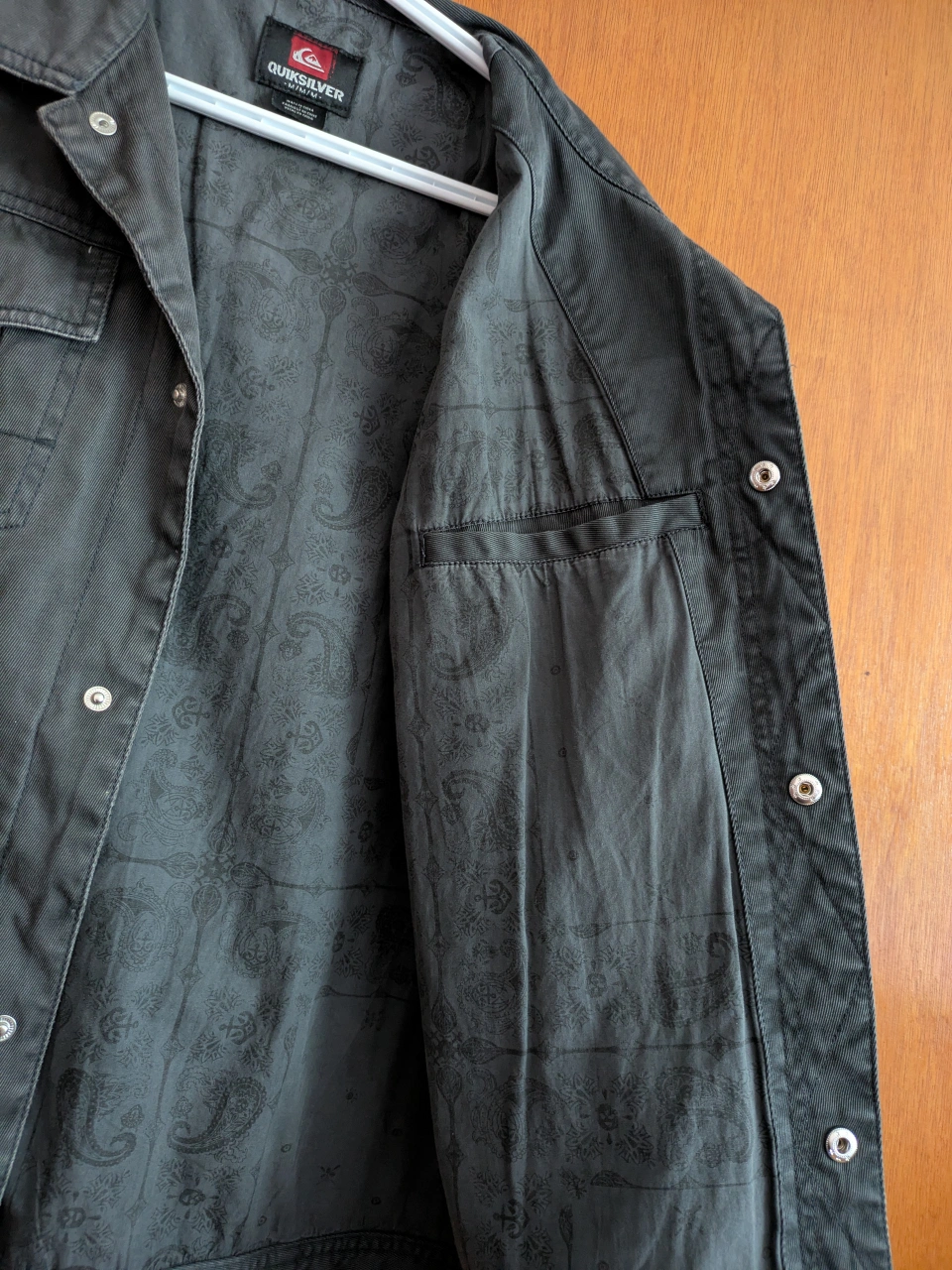 Selling a Quiksilver jacket in size M. It's in great shape and ready for a new home. The jacket features a cool paisley pattern on the inside lining. Perfect for adding a bit of style to your wardrobe!
