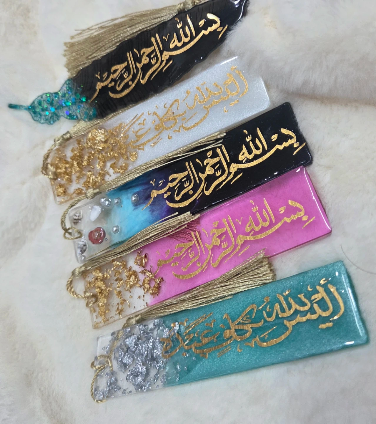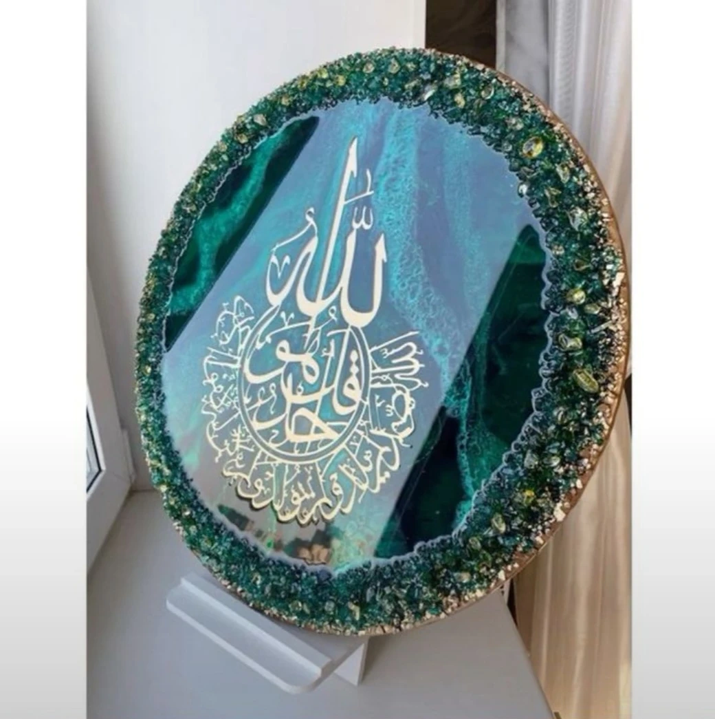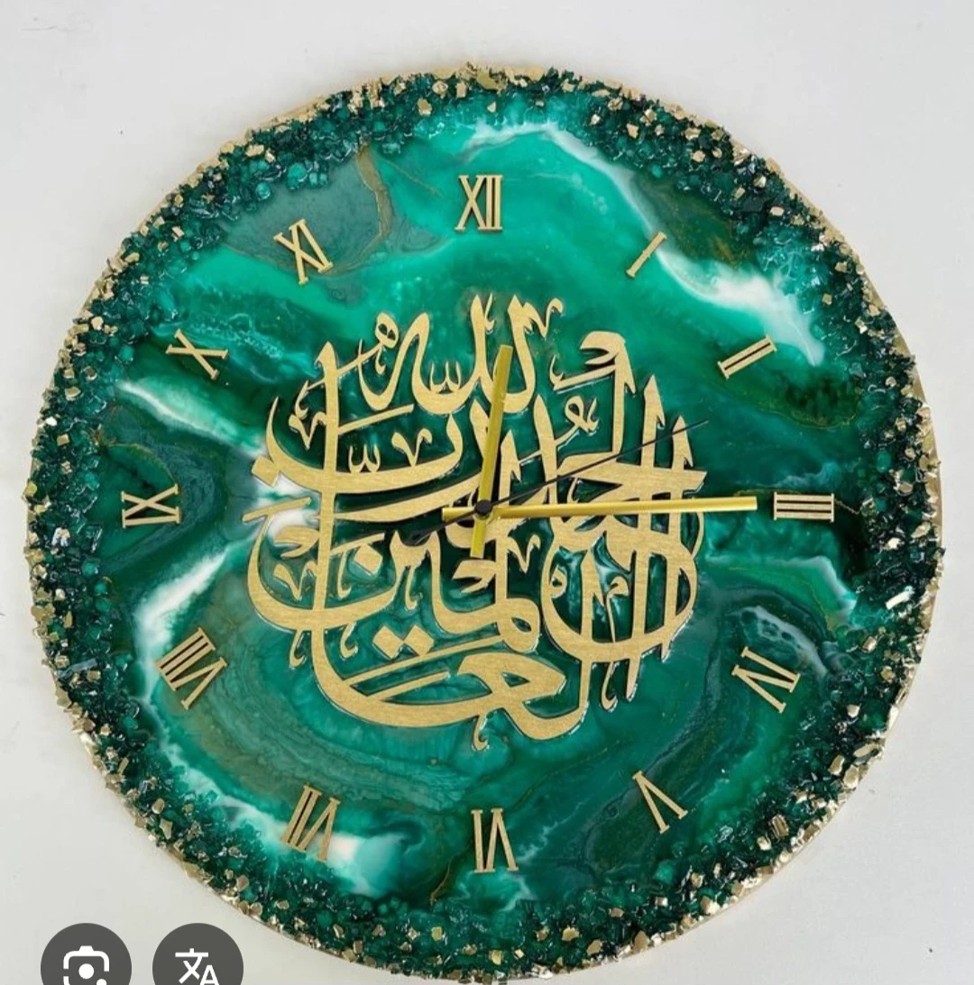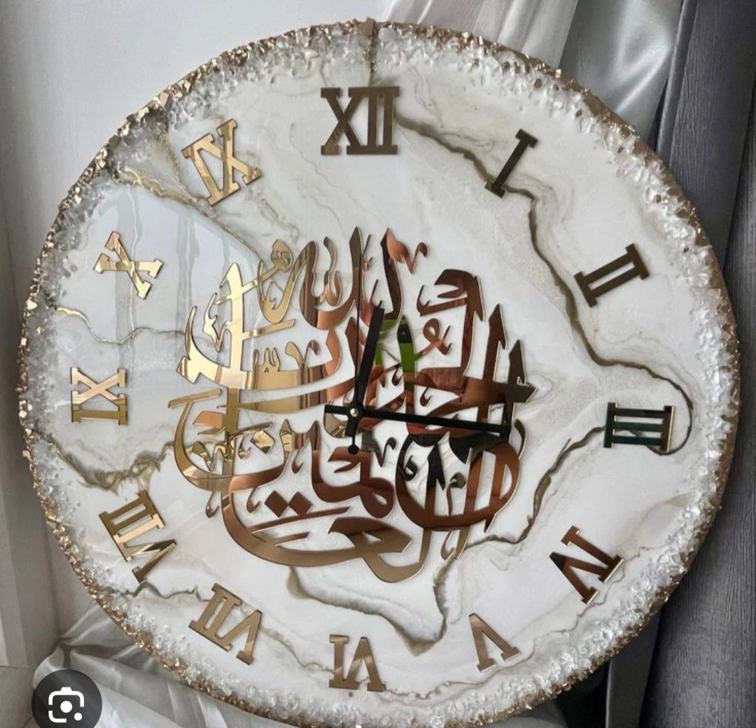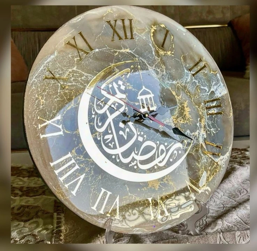 All kind of Ramadan favors available Decorative round wall clocks featuring intricate Arabic calligraphy and a marbled resin finish. It has Roman numerals for easy time-telling. This piece adds a touch of elegance to any room.