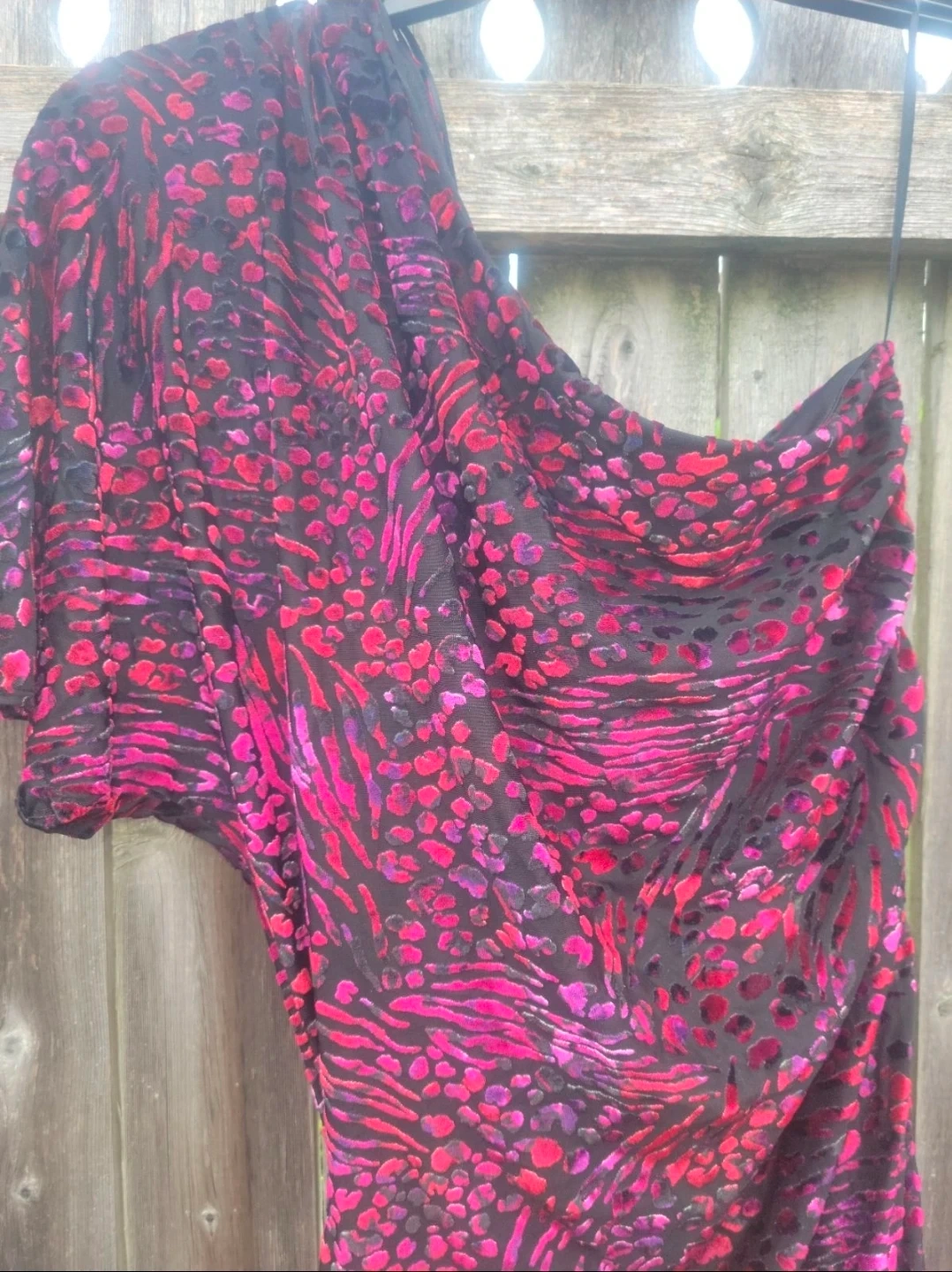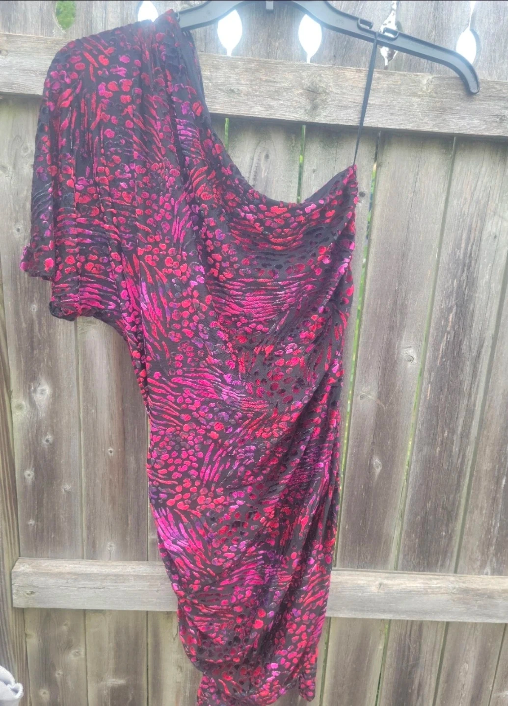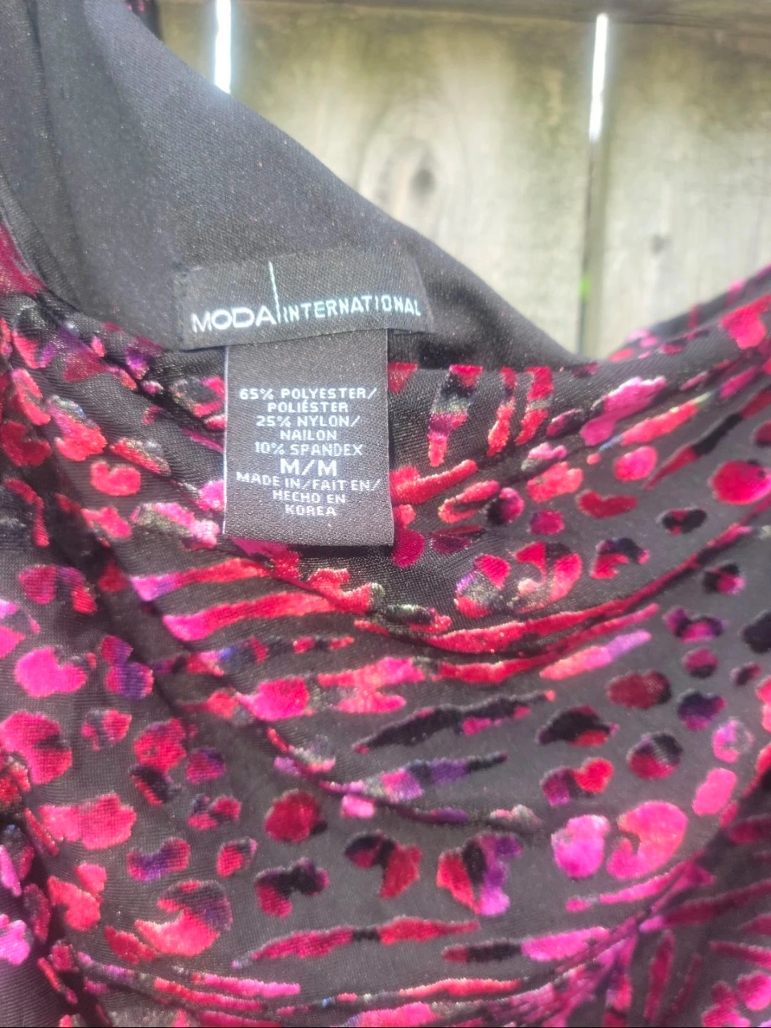 Moda International one shoulder dress. Features a vibrant animal and abstract print. Material is 65% Polyester, 25% Nylon, 10% Spandex. Made in Korea.