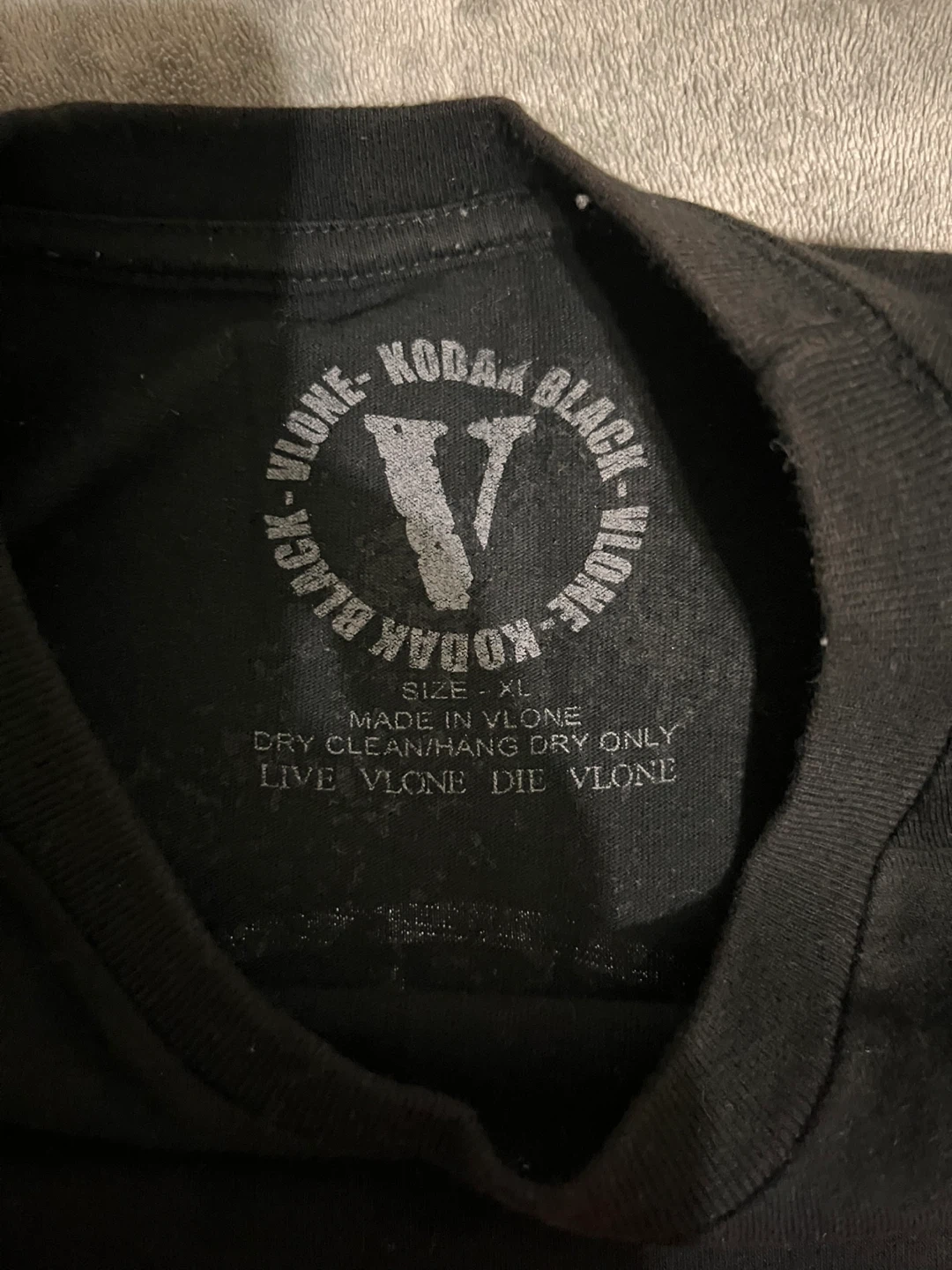 Selling a VLONE x Kodak Black T-shirt in size XL. It's a stylish piece with a unique design. This shirt is made in VLONE. "Live VLONE Die VLONE" is printed on the tag.