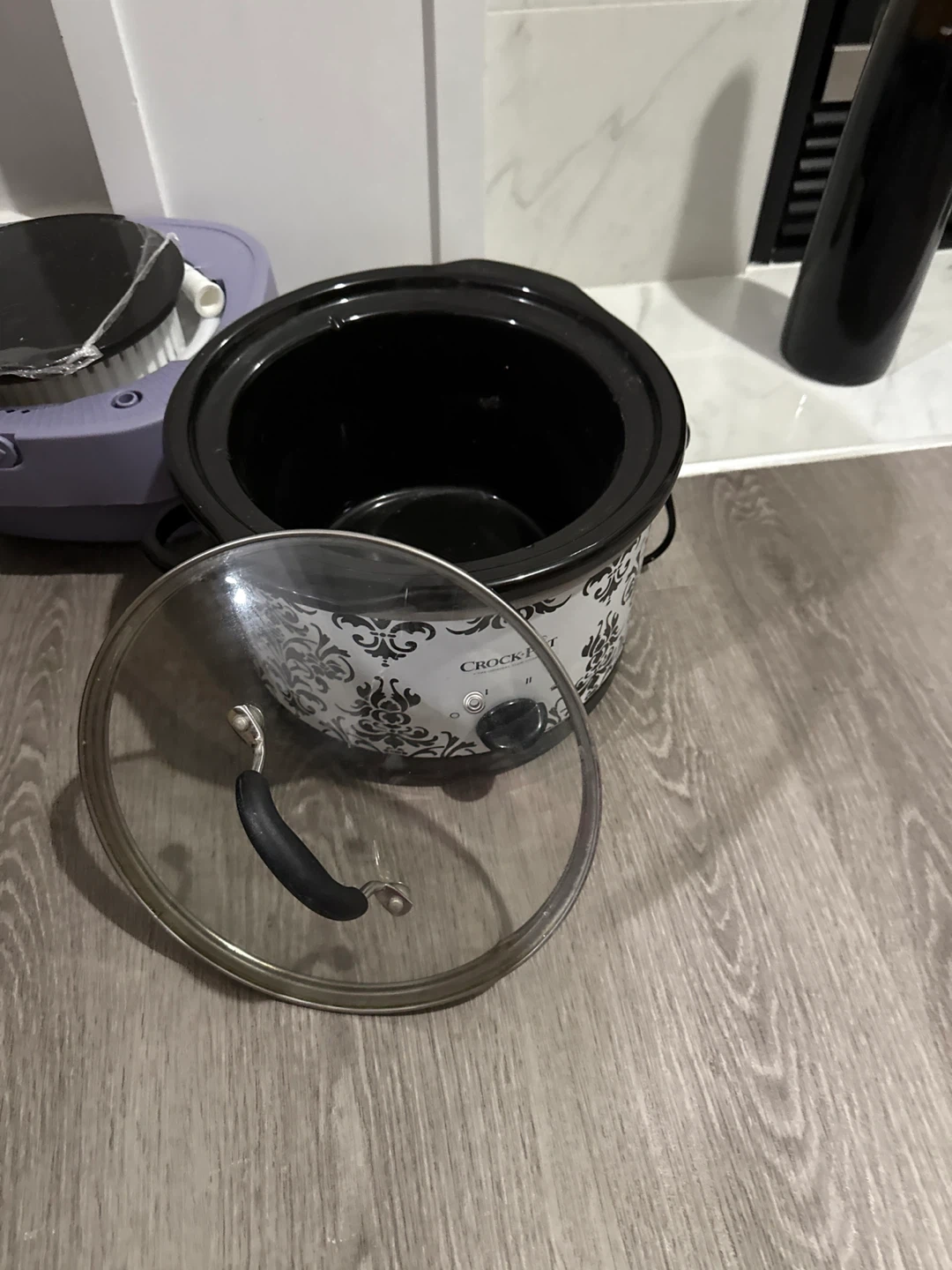 This Crock-Pot slow cooker has a decorative black and white exterior. It features a glass lid with a black handle. There are three settings: low, high, and off. It's great for making stews and roasts!