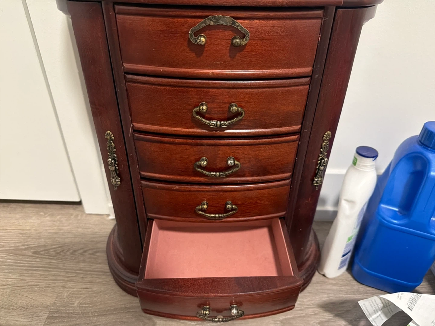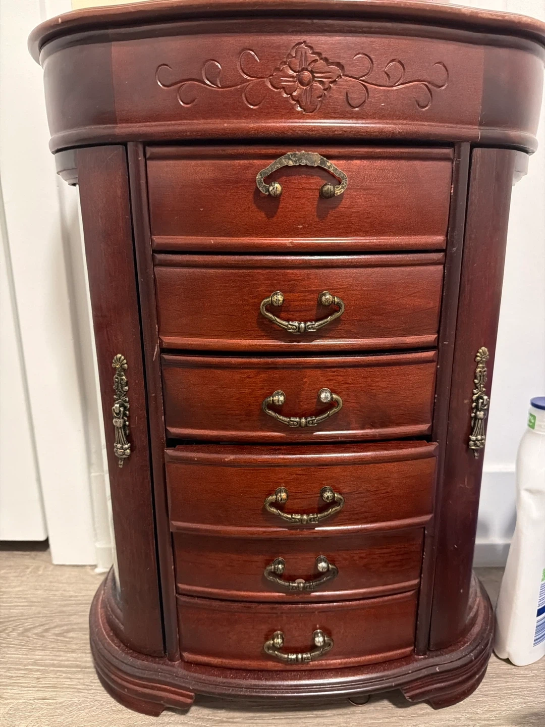 This is a wooden jewellery box with multiple drawers and side compartments for storage. It has ornate brass-toned hardware. Its compact size makes it perfect for a dresser or vanity.