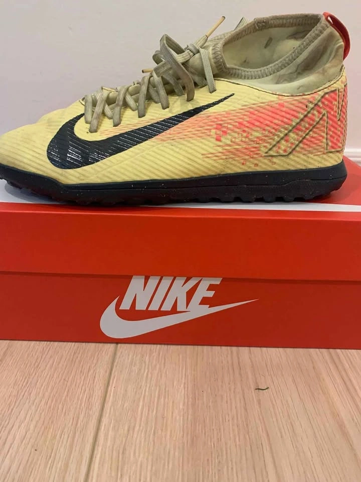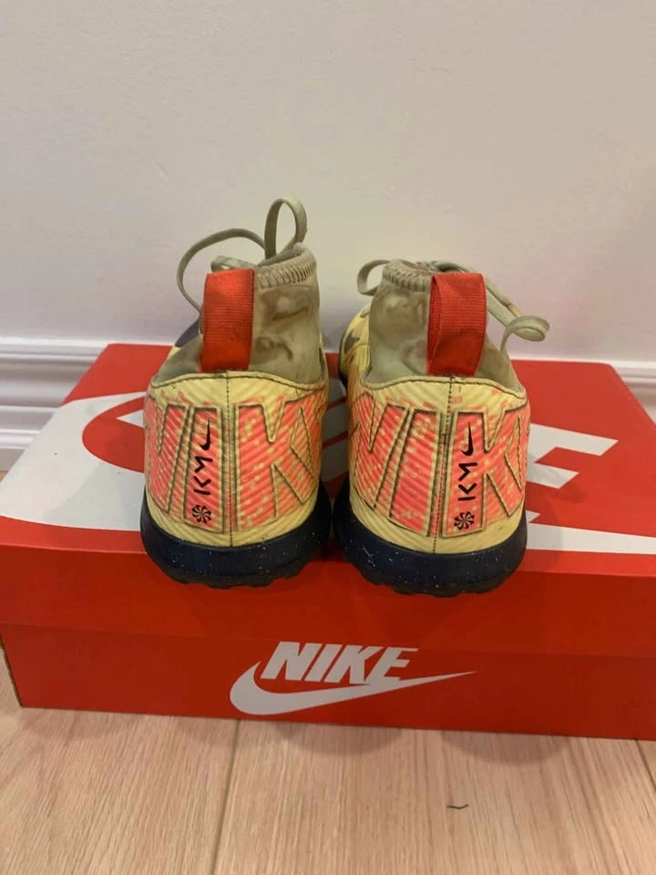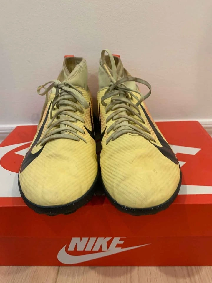 Vibrant Nike Mercurial turf cleats with cool yellow and orange colors and a black swoosh. Comes with original Nike box. Great for soccer practice or games. Size 6.