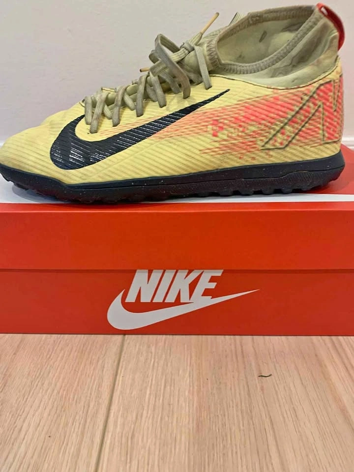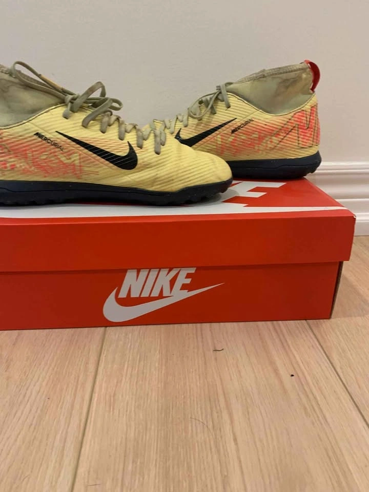 Vibrant Nike Mercurial turf cleats with cool yellow and orange colors and a black swoosh. Comes with original Nike box. Great for soccer practice or games. Size 6.