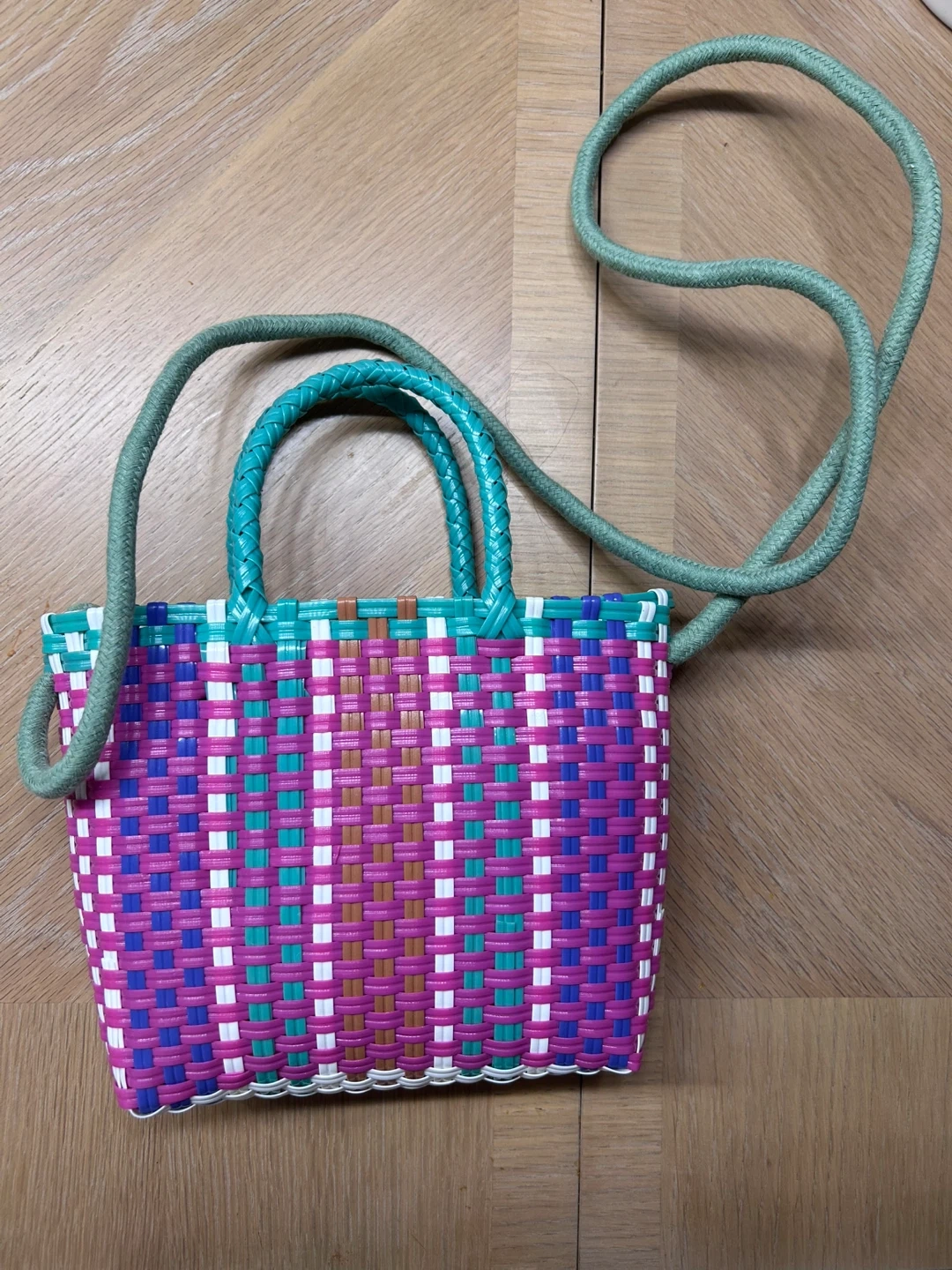 This is a fun and colorful woven plastic tote bag! It's perfect for carrying small items and adding a pop of color to your outfit. The bag features a unique woven design with pink, white, blue, green, and brown colors. The handles are a light green color. It's in great condition and ready for a new home