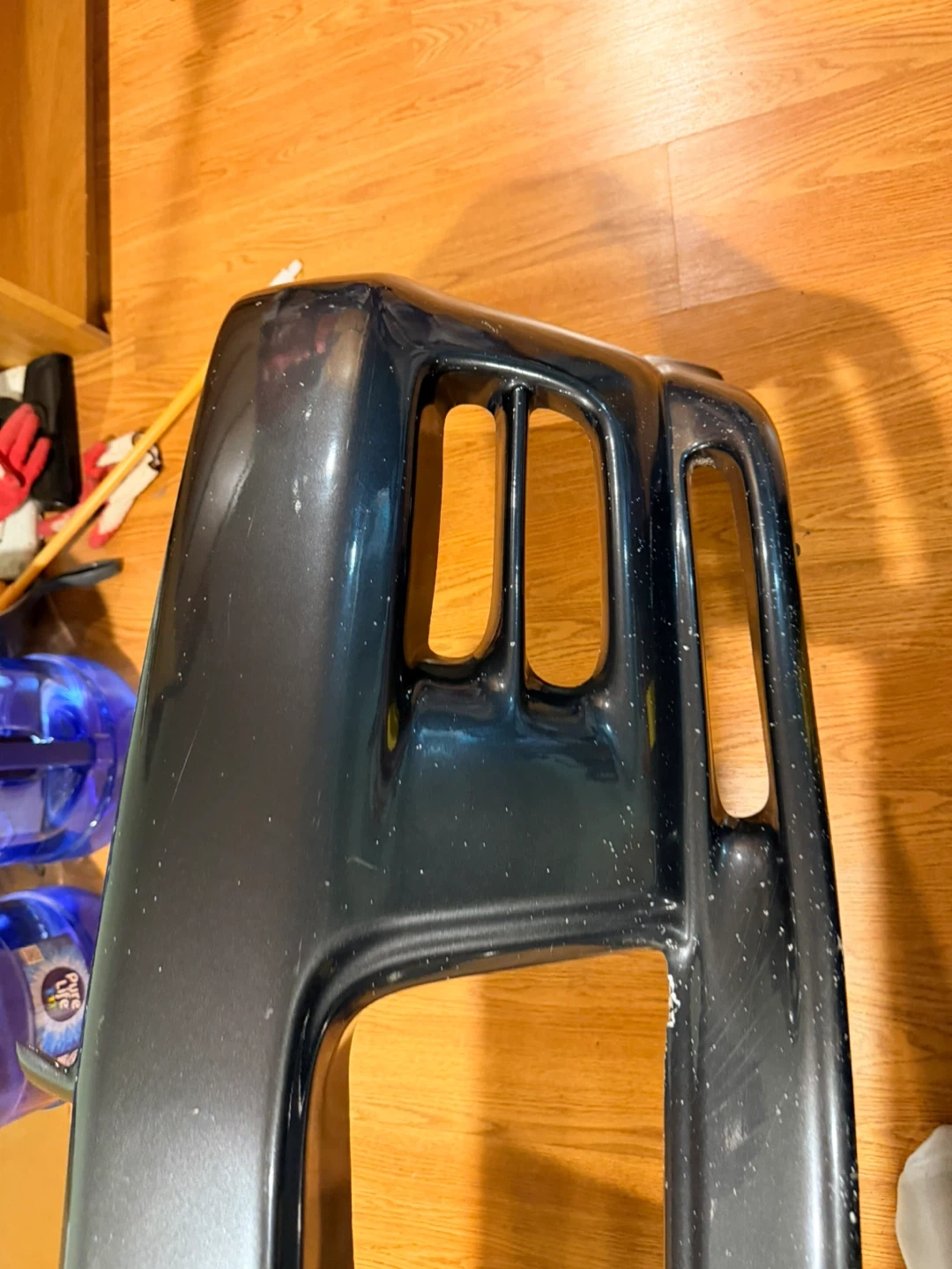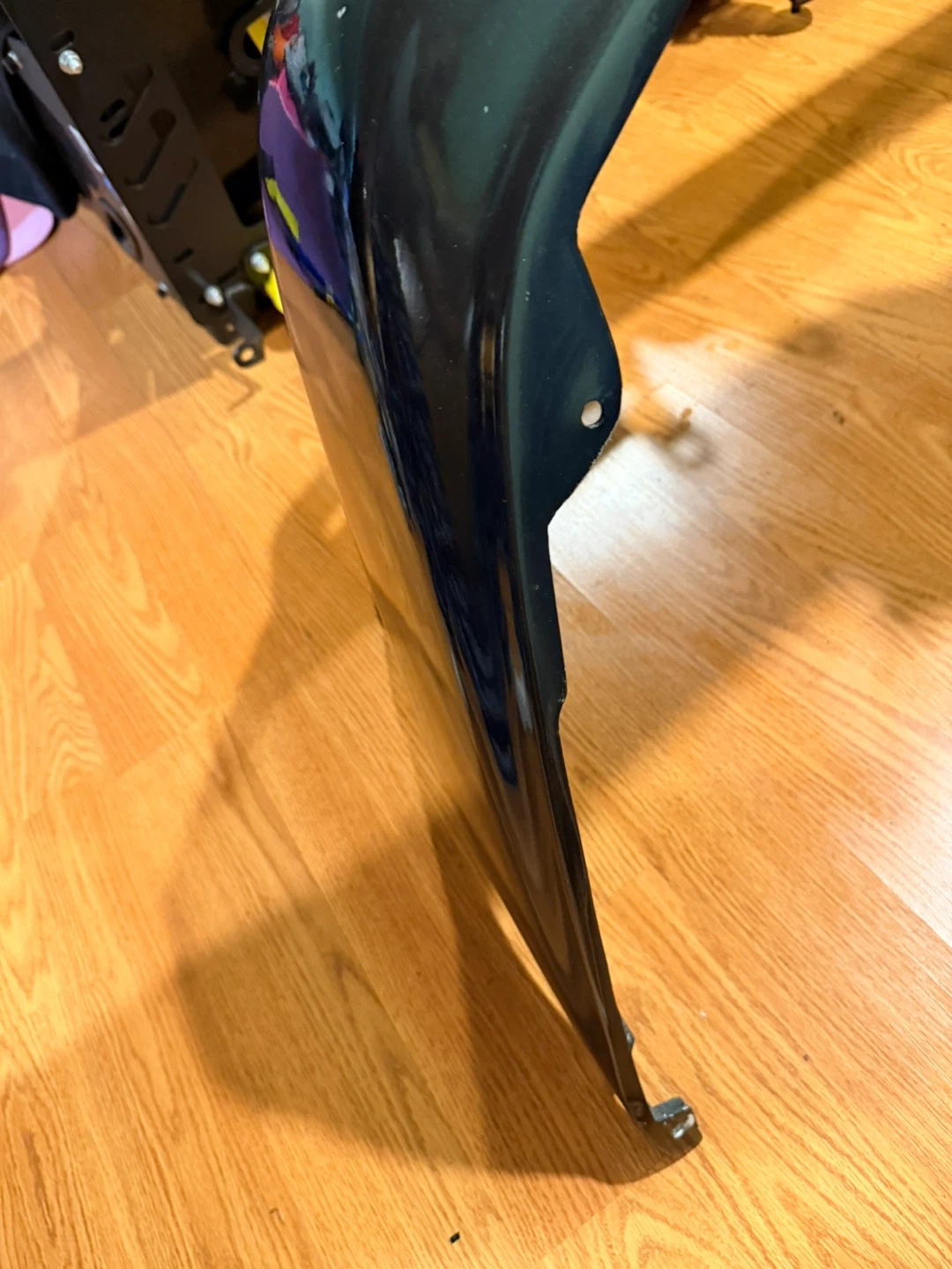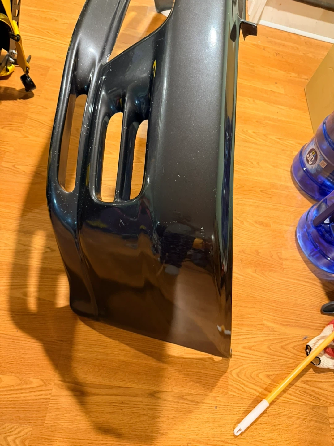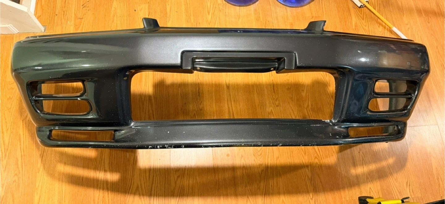 This is a dark gray front bumper. It has a glossy finish. This bumper is designed with multiple openings for lights and ventilation.
