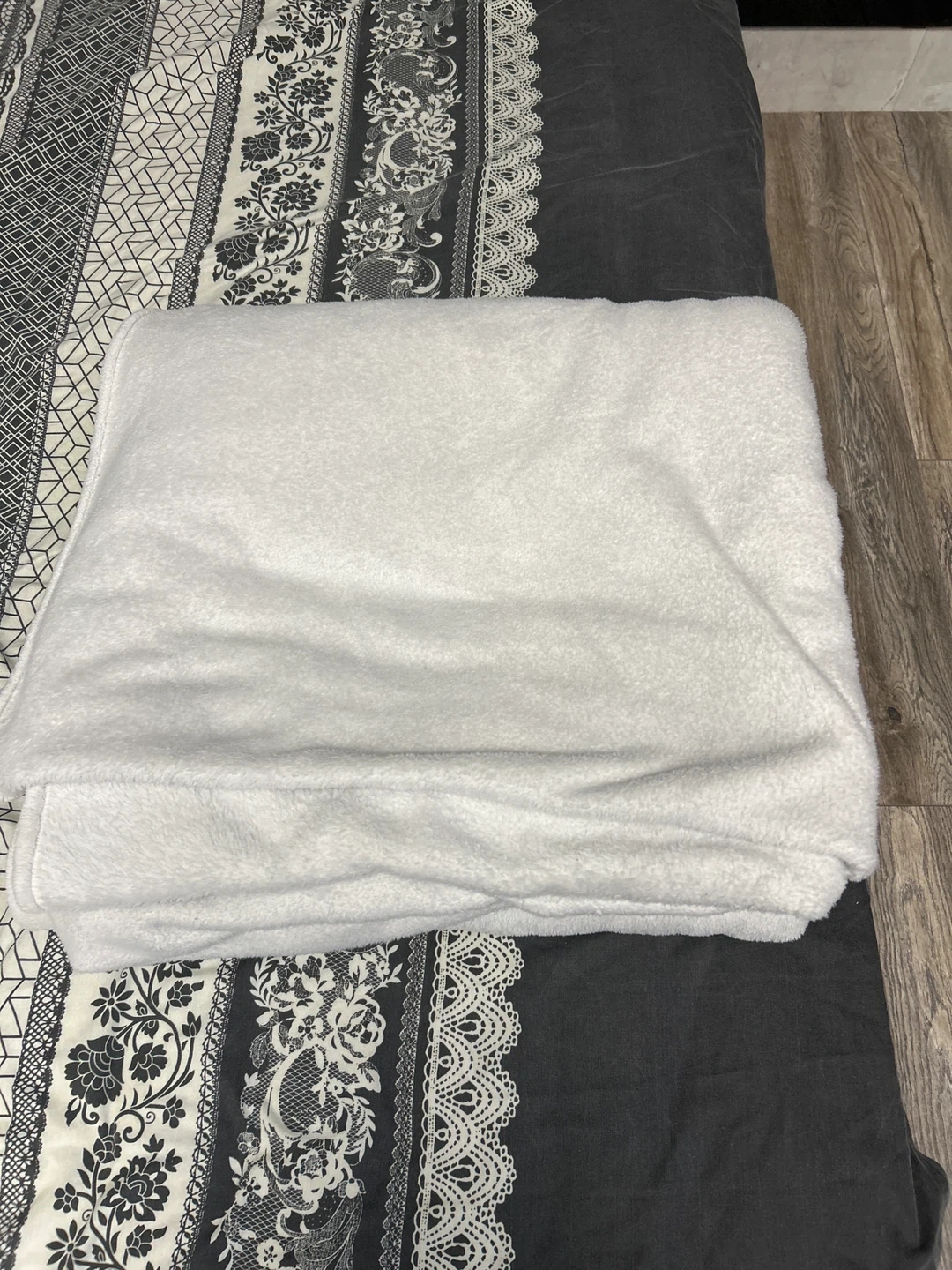 A cozy, light grey fleece blanket. It's made from soft material and feels plush to the touch. It's generously sized for extra comfort.It is full size mean king size bed’s blanket.