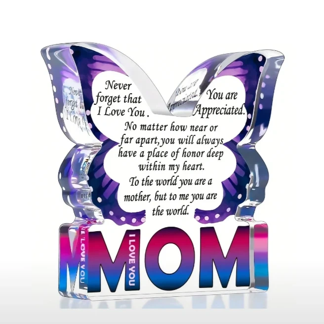 Beautiful crystal figurine shaped like a butterfly. Features the word MOM and a heartfelt message. Perfect Mother's Day or birthday gift. Measures approximately 3.15in x 8.0cm.