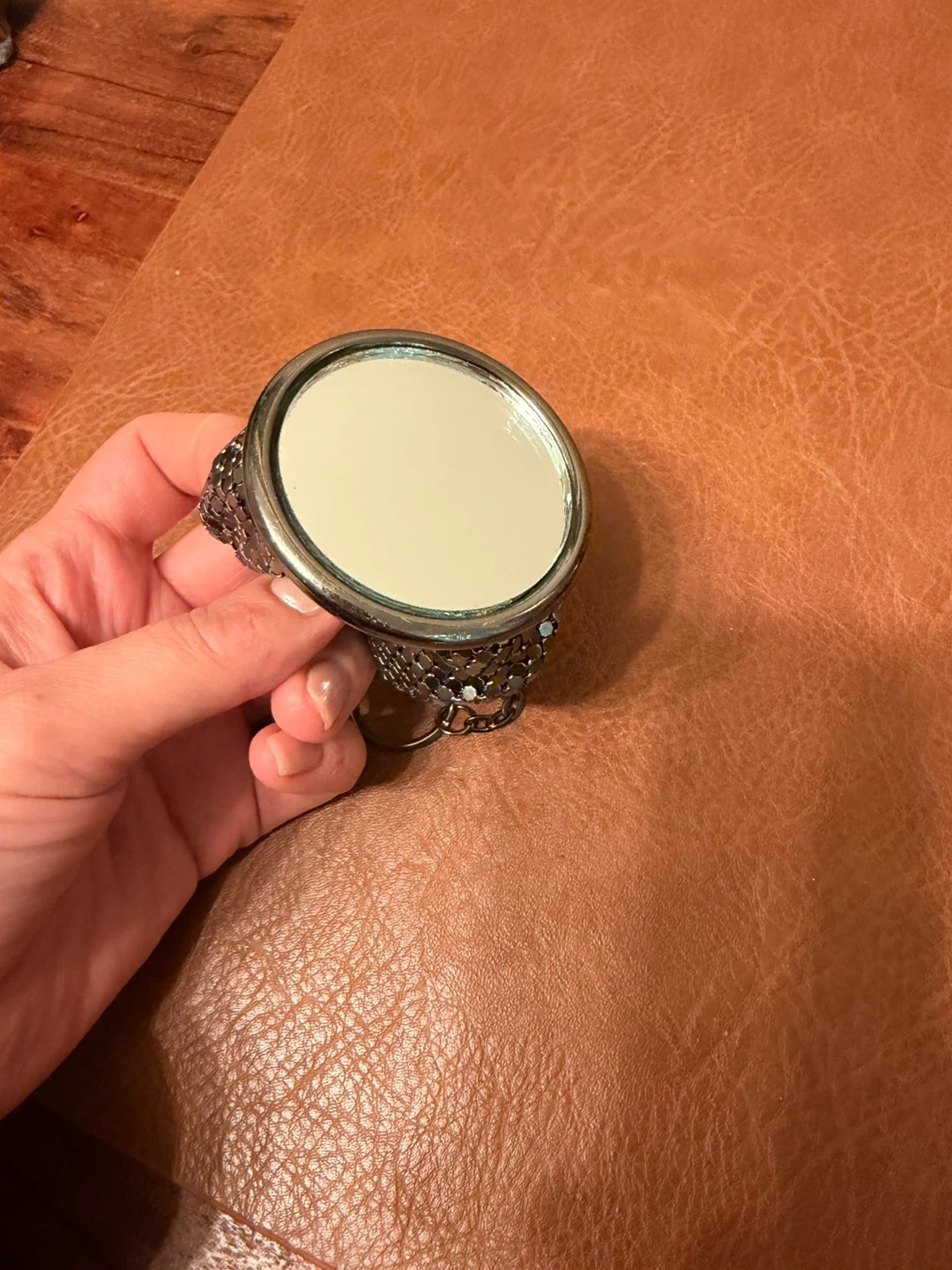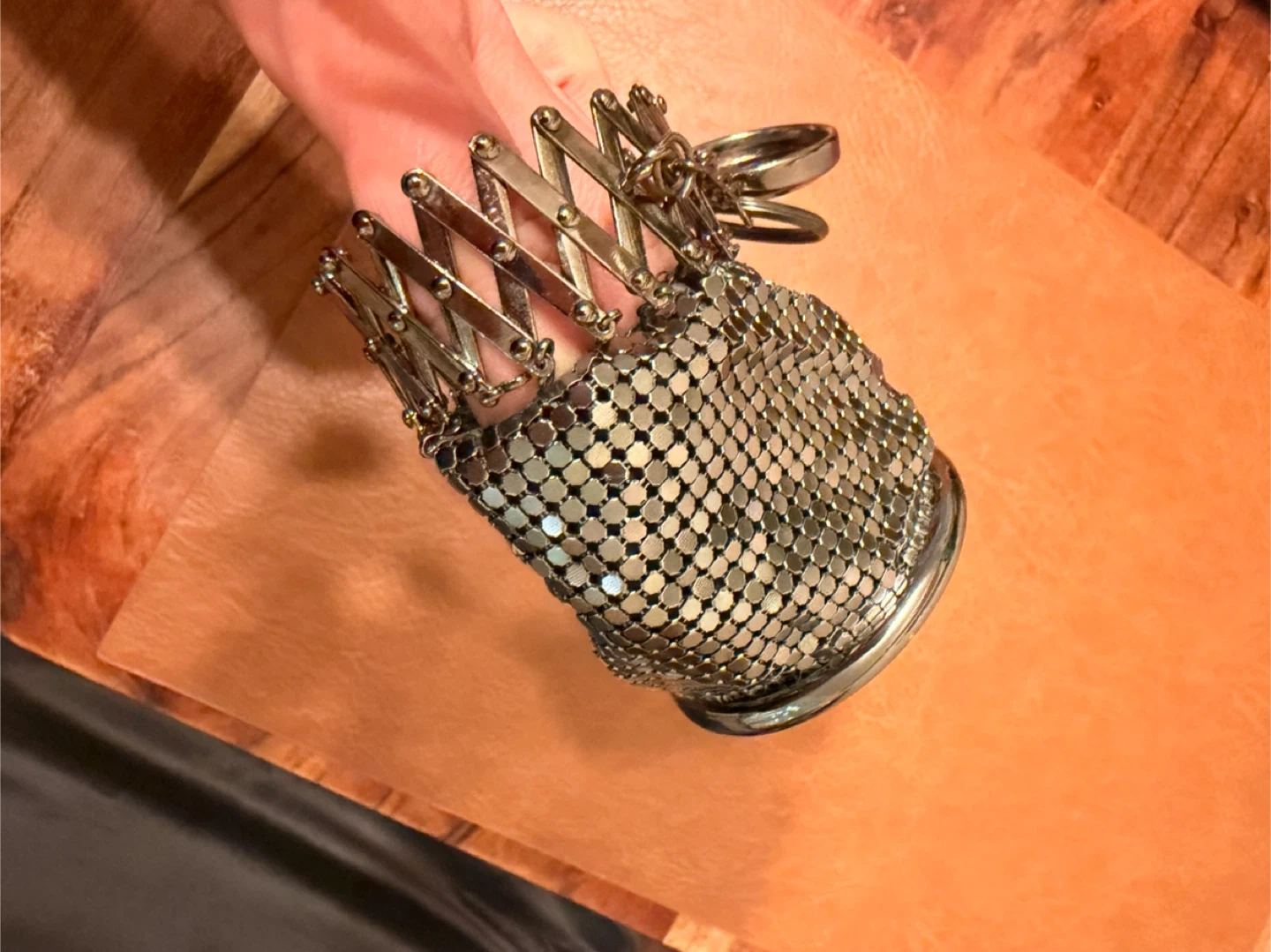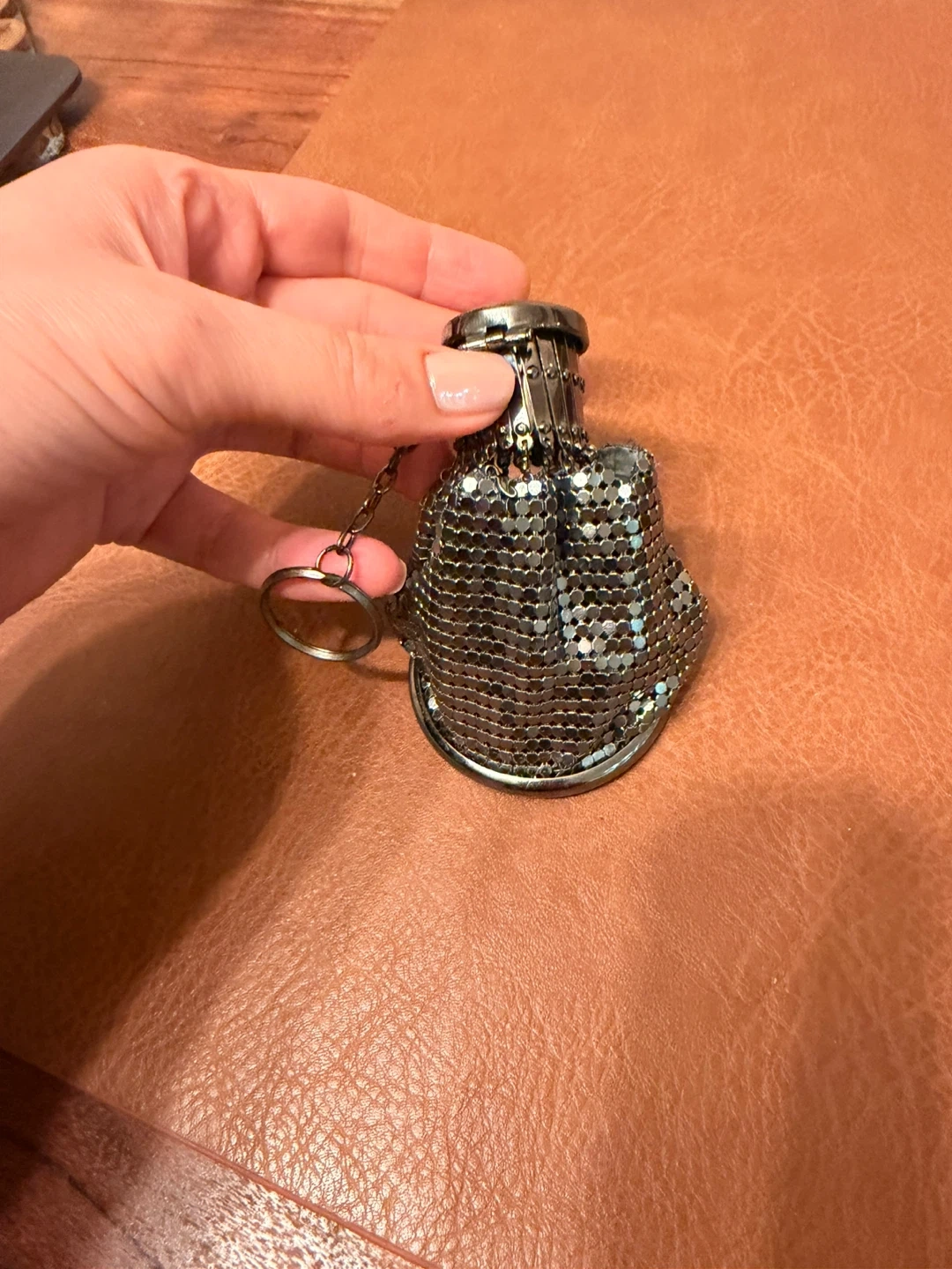 This is a vintage coin purse made of metallic mesh. It features a built-in mirror for touch-ups on the go. The purse has a pull-out mechanism and a ring for attachment. It's a unique accessory for carrying small essentials.