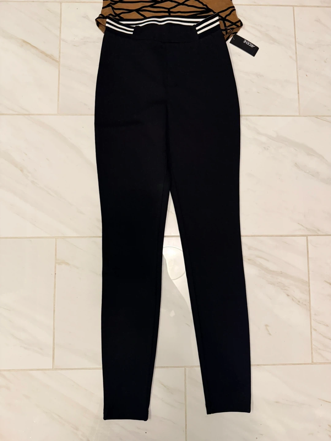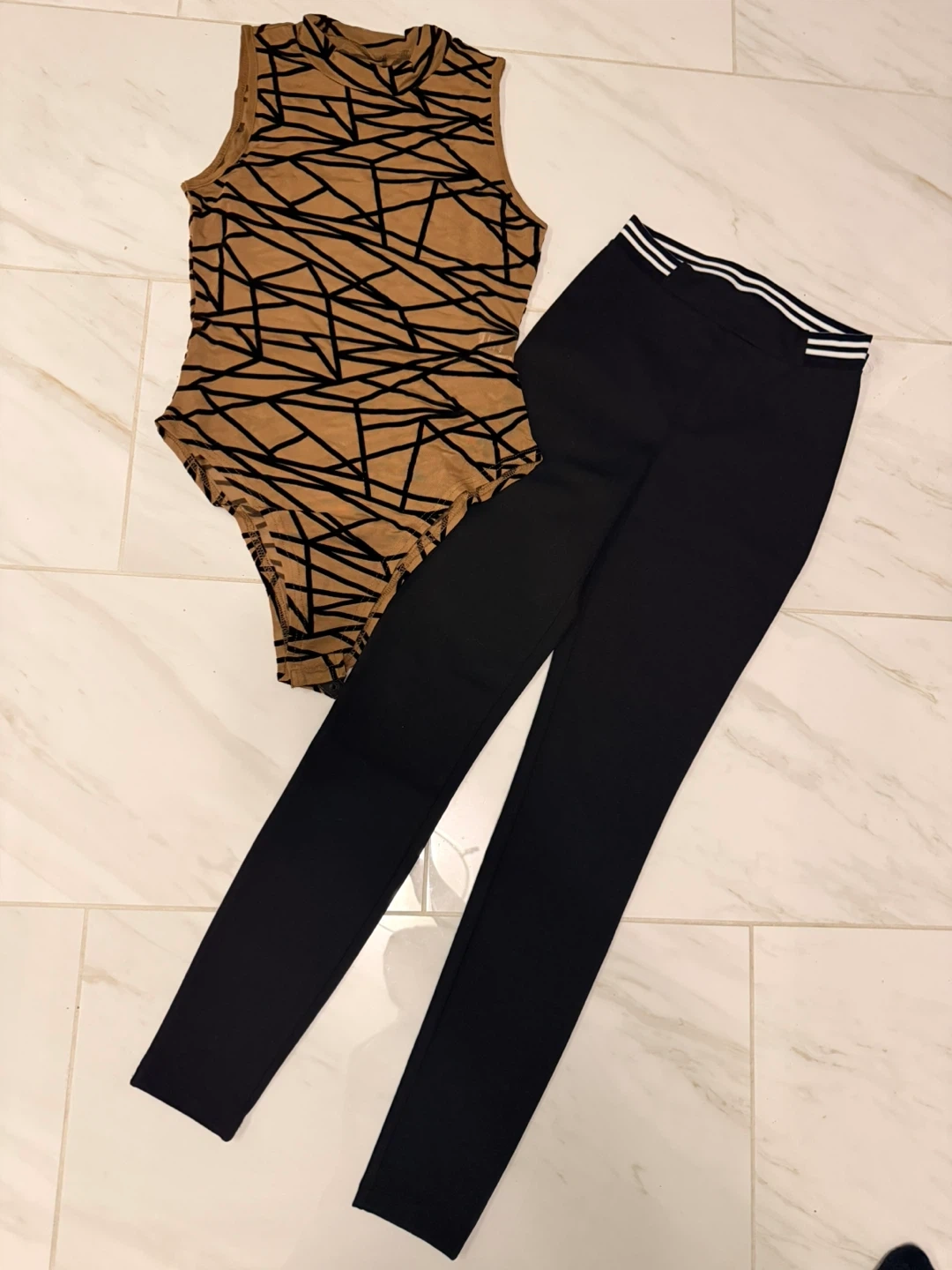This set of two clothing pieces are new and includes a tan abstract print sleeveless turtleneck tank bodysuit and black leggings. The leggings have a white striped waistband black ponte